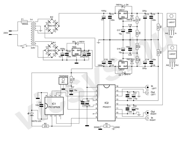 Pedig szükség lenne a második, külön, független tápra. Az FPGA 2311 áramkör egy nagyon érzékeny áramkör, független, agyonstabilizált, agyonszűrt tápra van szüksége, hogy hozni tudja a paramétereit. Nem lehet közös tápja a digitális vezérlésével. Ha mást nem, akkor használj két egyforma 9 V -os trafót, az egyikkel megcsinálod a dupla tápot az előzőek szerint, a másikkal pedig egy 5 V -osat a logika részére. Próbából szűrőtagokkal elválasztva járathatod az egyik oldalról is, de úgyis meg fogod látni a független táp szükségességét.