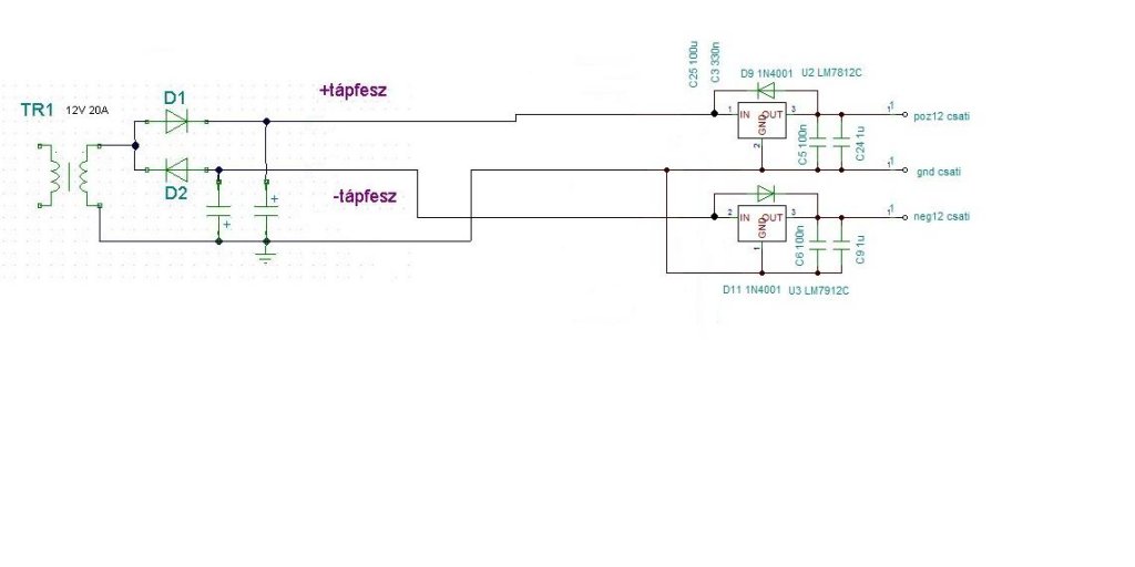 Ha műszerrel rámérsz a rajzodon levő kimenetekre, akkor a GNd -hez képest a + tápfesz kivezetésen +12,6 V ot, a - tápfesz kivezetésen - 12,6 V -ot fogsz mérni. Erre kell tenned a pozitív tápfesz kivezetése, és a GND közé a 7805 -öt, és a negatív tápfesz kivezetése, és a GND közé a 7905 -öt. Akkor mennyi is van a stabkockák bemenetén?
