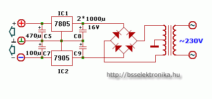 Egyébként a rajzon lévő kapcsolás megfelel a 7x05 stabilizátoroknak megfelelő kapacitású kondenzátorok, és trafó esetén.