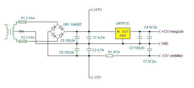 Az egyenirányító híd és a pufferek maradnak az eddigiek. A táp arányos terhelése érdekében a ventilátort a negatív ágra tettem, a pólusait értelem szerűen kell bekötni. R1 értékét úgy válaszd meg, hogy a ventilátor kapcsain 12V, vagy kevesebb legyen a feszültség. A kisebb feszültség előnye, hogy halkabb lesz a működés, ha elegendő úgy is a szállított levegő mennyisége. C7 a lehető legközelebb kerüljön a ventilátor kivezetéseihez, mert annak működése zajjal szórhatja meg az erősítőt.
