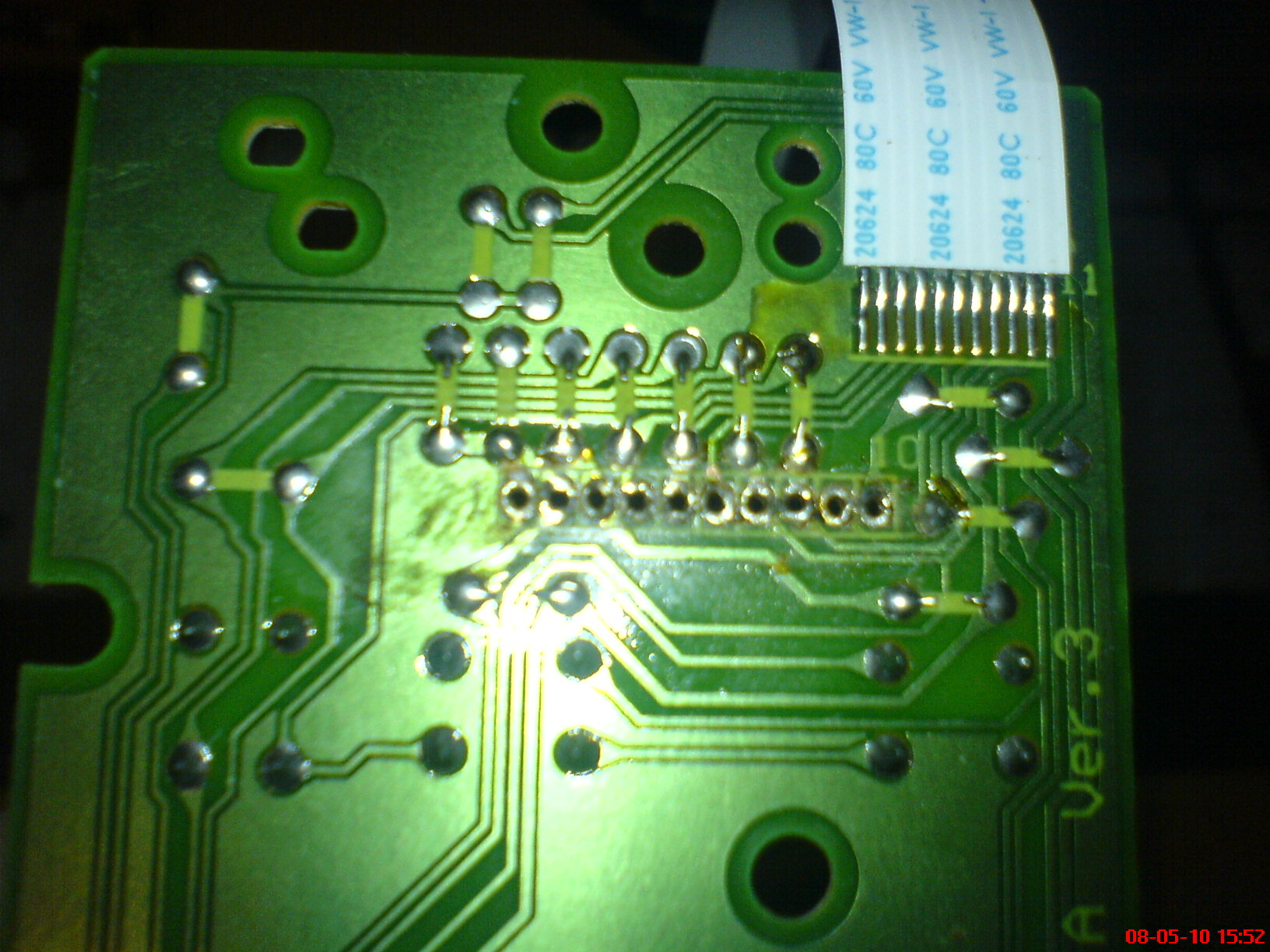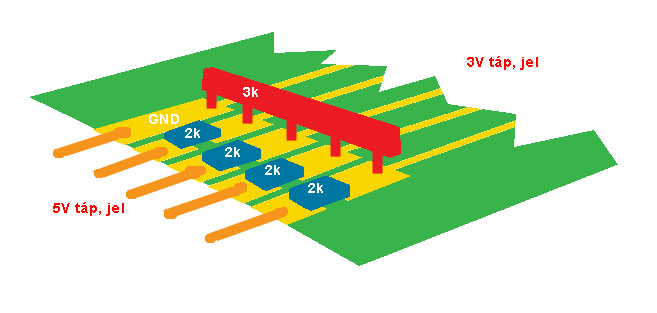 Ha 5V-ról használod a cuccot (programozás közben nem húzod le) akkor tegyél 2K-s ellenállásokat (SMD 1206) sorban, majd egy ellenállás létrát keresztbe (furatokba) Ezáltam 3V-ot nem lépi át a jel és táp.