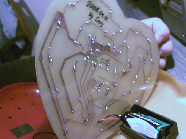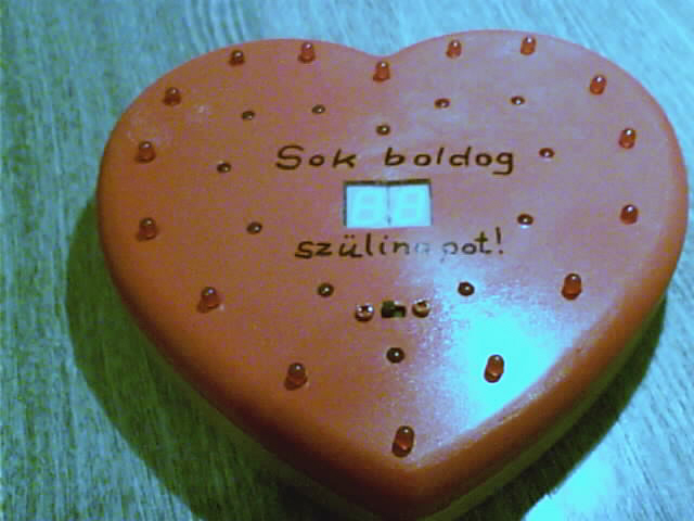 A kapcsolás fainul működik! Egyszer már énis megépítettem barátnőm szülinapjára, és nagysikert arattam vele. Itt van pár kép. Az én ötletem az volt hogy bele építettem egy konyakosmeggyes csoki dobozába. Szerintem abba a legjobb. Ja természetesen lefújtam pirsora a tetejét. És 9V-os elemről működik. A mai napig .