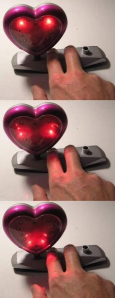 Igen én építettem a rajz alapján. Mivel mindíg a dobozolással van a baj, azt volt a legnehezebb "beszerezni". Először csokisdobozba ment volna ez is, de szerencsére egy kínai boltban rábukkantam egy szív alakú órára (300Ft). Kibelezés után bereszelgettem a panelt, az aljába pedig elfért a 9V-os elem. Az egyik mikrokapcsoló a főkapcsoló egyben, a másik pedig úgy van átalakítva, hogy az az érintőszenzor. Csak úgy működik, ha mindkét nyomógombot benyomjuk. Minél kisebb az ujjvégek ellenállása, annál gyorsabban szaladnak körbe a ledfények. Szerelemteszter...