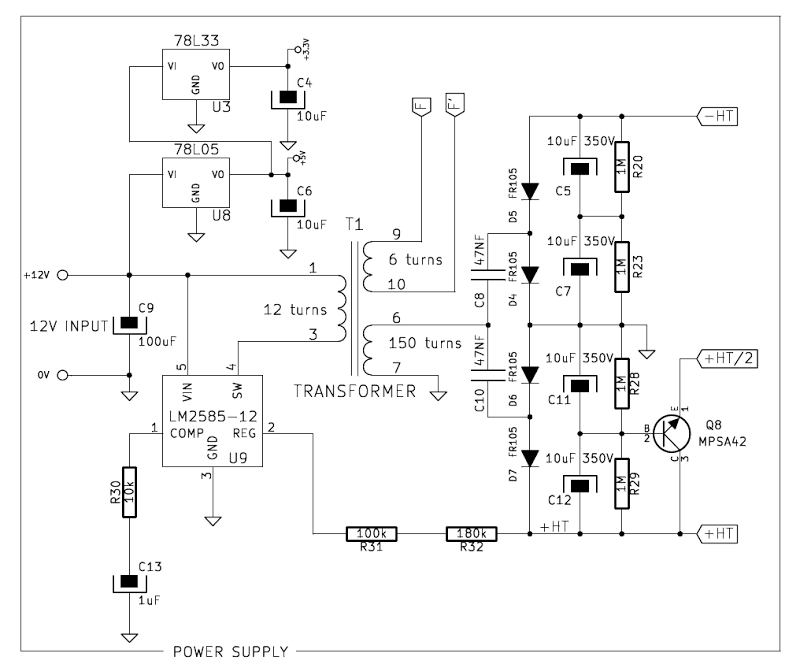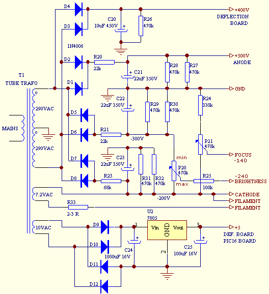 A nagyobb anódfeszültségű csövekhez a 400V-os ág lett felhasználva feszültség háromszorozóval.(1200V)