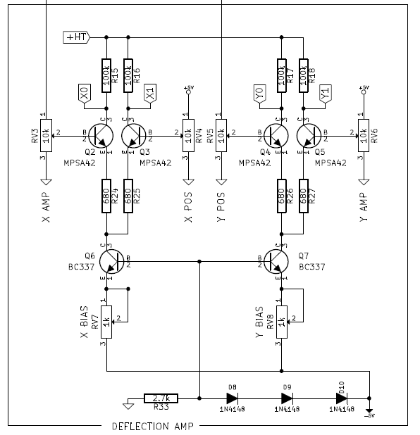 Üdv Mindenki! Én is megépítettem az "oz2cpu" design-t. Volt régről itthon egy mullard dg7/6 csövem. Ez egy elég kicsi cső pár száz volttal már elmegy. Az anódot egy csöves rádió trafójával oldottam meg, bónuszként erről a trafóról a fűtést is meg tudtam oldani. A negatív nagyfesz és a digit rész tápja már egy külön trafóról jön, aminek van két egymástól független szekunder oldala. A negatív nagyfeszt a nixie-órából ismert klasszikus fetes 555-ös ic-s kapcsolás adja.Könnyen bele lehet futni abba, hogy a kép bal felső sarka "kockás" akárhogy vannak variálva a potik. Az eltérítés x y bemeneteit nem direktbe, hanem egy 6k8-as ellenállással kell a DAC-ra kötni, ezután a tranzisztorok bázisát egy 1k8-as ellenállással rá kell kötni a +5v-ra vagy a testre attól függően hogy mikor lesz jó. Nekem így lett jó.