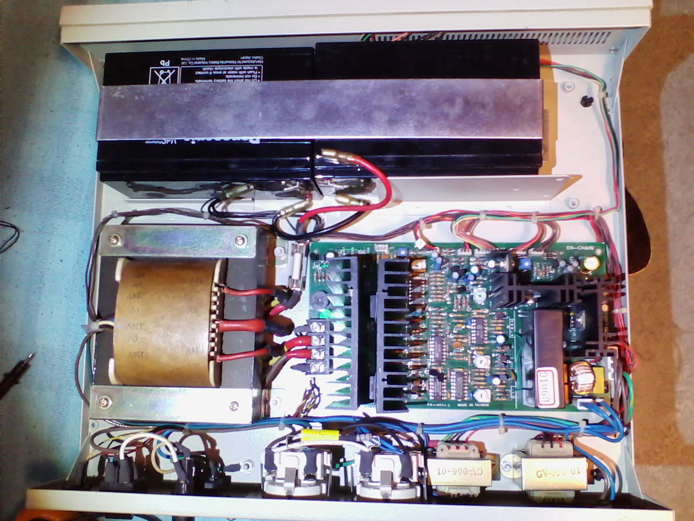 Azt szeretném megkérdezni, hogy a csatolt képen lévő szünetmentes tápegységben vajon lehet-e túlfeszültség elleni védelem is. Illetve, hogy ha akkukról megy a táp akkor zizegő hangot ad ki(minél nagyobb a terhelés, annál hangosabb ez a hang. Vajon ez annak a hangja hogy a trafó vaskereten mozog a réz huzal? Esetleg ránézésre hány W os lehet? 30A-es biztosíték van az akkuknál. A hátulján van egy táblázat, ott a 30A-esre 600VA van írva. Ez reális érték?