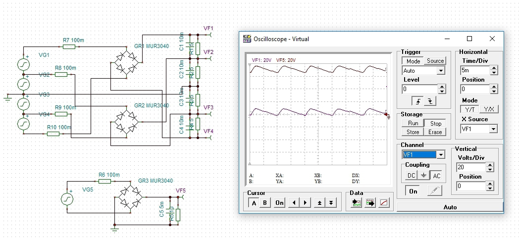 A terhelés szempontjából ott soros eredőd lesz, azaz fele kapacitásod ahogy a szimulátor is mutatja a búgófesz nagyságából. Alul külön a VF5 80V 5000µF kondival, ugyanakkora búgófesszel mint a VF1 és a föld közti pontokon ugyanakkora terhelés mellett, azaz ugyanakkora kell legyen a kettő kapacitása.