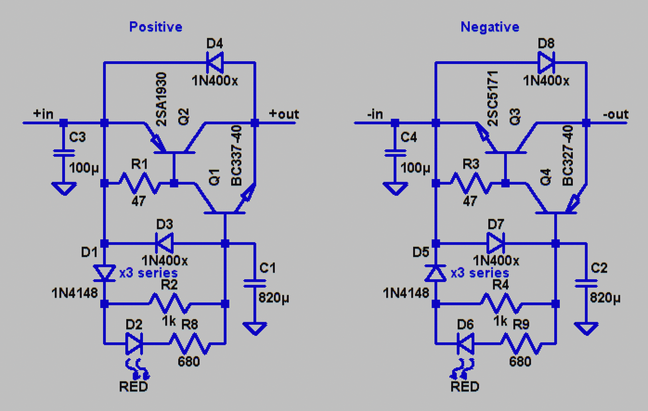 Aki beírta az alkatrészeket, nem túl sokat tudott róluk. BA157 400 V-os, BY299 800 V-os dióda. Ennek megfelelően nem túl kicsi a feszültségesése. Ha 5-10 A-es, akár PC tápból kiszerelt Shottky diódákat használunk, ~fele a feszültségesés. 200-400 mA-en még elég jó áramerősítésű tranzisztorokat találni. Még a 15-20 A-es teljesítménytranzisztorok között is akad, ami ezen az áramon 20-szoros erősítést produkál. Nem írt tranzisztortípust, de a bázisellenállásokat se méretezte be. Jó lenne megtalálni a kész rajzot, de meg lehet találni a megfelelőket. A szövegben Darlington párokat ír. Mellékes a bázis nyitófeszültség, a földelt emitteres kapcsolásból következik, hogy a kollektoron az áramterhelésnek megfelelően akár 150 mV-ra is lemehet a nyitófeszültség.