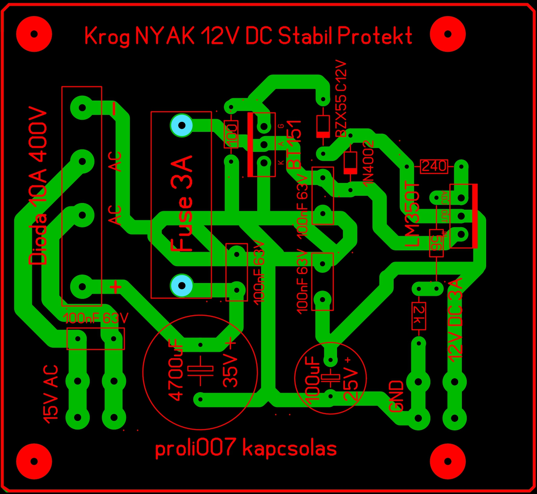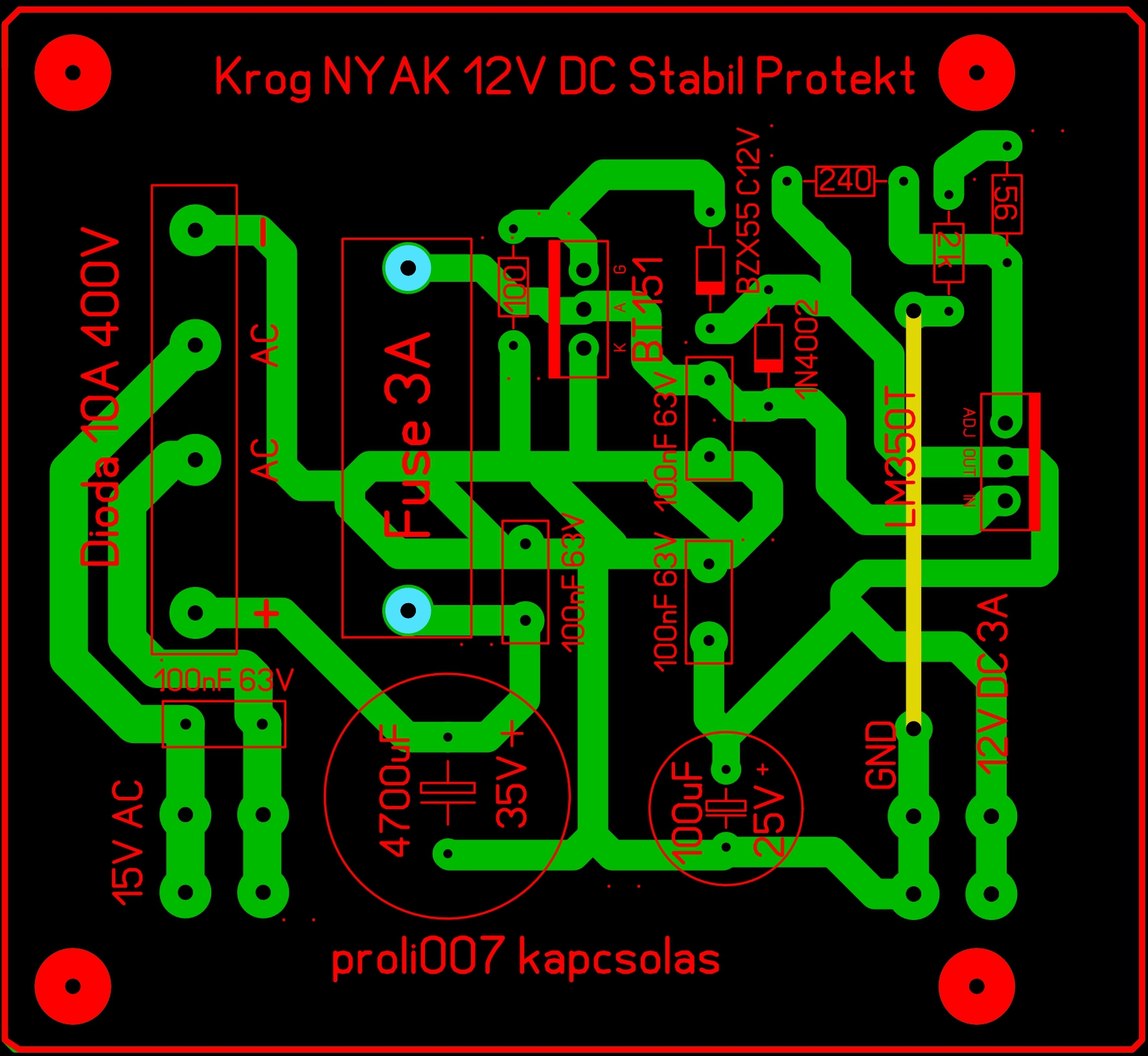 Szia! Légy szíves nézd át nekem a paneltervet, mert csak tanulgatom még a tervezést. Jól vezettem az áramköri vonalakat? Azért lett benne 2x4700µF mert pont kettő van belőle, a 10A dióda híd meg azért mert olyan van itthon.
