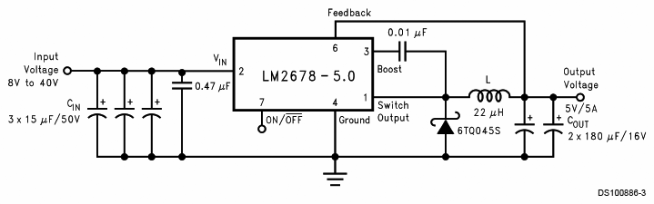 Még régebben építettem én egy 5V Step-down tápot, az IC leírásában található minta alapján, amit ide mellékeltem. Ez a kis elektronika viszont sajna bekavar egy másik, hozzá közel lévő elektronikának, köszönhetően a toroid mágneses terének. Arra gondoltam, mi lenne, ha egész egyszerűen azt a kis 22 uH-s toroidot szépen eltávolítanám? (és egy rövidke kis kábellel átkötném a helyét persze) Így az egész elektronika nem csinálna szinte semmi mágneses teret, és nem kavarna be más elektronikának. Amúgy egy kis kompresszort üzemeltetek ezen a step-down-on, ami úgy 5A-t eszik. Szerintetek kivehetem a toroidot? Nem csinálok vele bajt? Nem füstölöm el vele az IC-t vagy akármit?