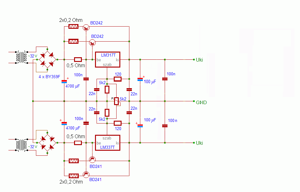 Szerkesztettem egy ilyen tápot, persze innen-onnan más rajzokból. Alkalmazkodtam a meglévő alkatrész készletemhez, 2 - 32 V-ig menne elvileg. Az LM 317-es TO 3 tokban van, 1,3 A után nyitná a kerülő tranzisztorokat. A gondom az, hogy szerintem a tranzisztoroknak nincsen rövidzár védelmük. Mit szóltok hozzá, vagy talán úgy kérdeznék hogy mi az ami nem jó benne szerintetek?