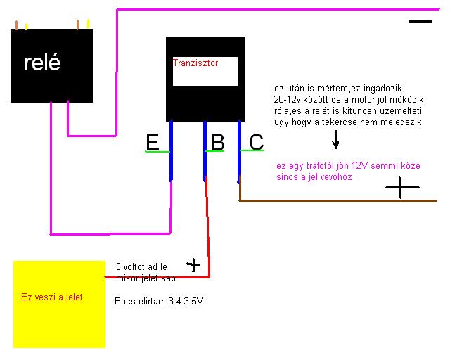 Nem tranzisztor kapcsolja a relét hanem egy elektromos motor (2 elektromos motorbol csináltam relét csak az a baj vele hogy mikor a motor erölködik akkor nagy ampert vesz fel és összeég az érintkezöje és folyamatosan megy magától)