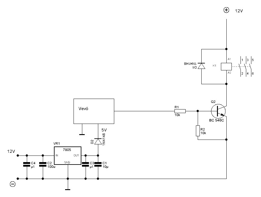 Hello, van itt még néhány dolog. A relémeghajtó tranzisztor bázisára, sorosan, kellene egy 10kOhm, mert a nagy bázisáram tönkreteheti. A relével párhuzamosan is kellene egy dióda záróirányban, mert az első kikapcsoláskor keletkező induktív feszültség szintén tönkreteheti.