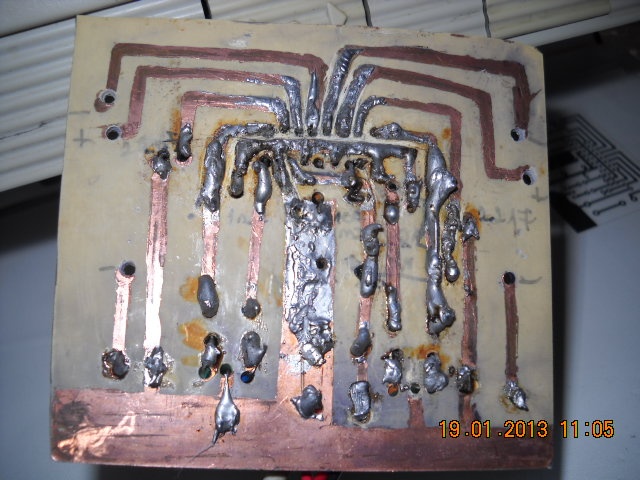 Nézd át azokat, amiket Peti is írt, aztán tegyél az IC-re hűtést, és jöhet a próba. De el kell mondjam, egyik-másik forrasztás nem túl szép... Kicsit hidegforraszosnak tűnik, lehet nem túl jó minőségű forrasztóónt használsz. Van benne gyanta?