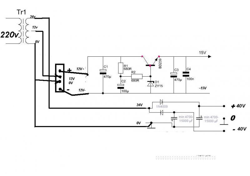 A felso reszen, ilyen bekotesnel sosem lesz -15V a foldpotencialhoz kepest, mert asszimetrikusan van bekotve a transzformator. Egyutas egyeniranyitoval nem illik/szokas erositot kesziteni. |