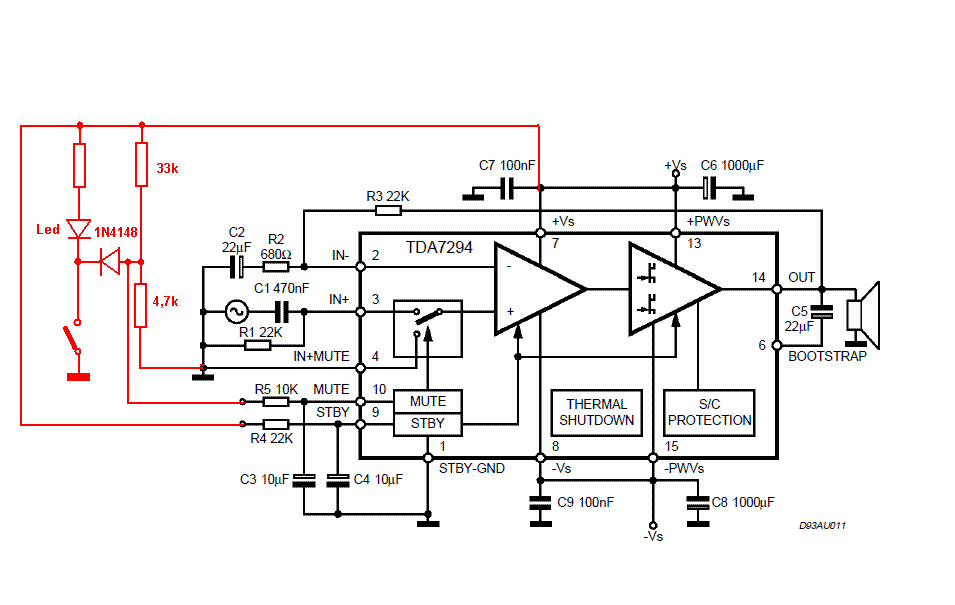 Most készítek nyákot az eredeti adatlapi kapcsolásról. Ha nincs szükségem a STDBY lábra akkor az R4 ás C4 elhagyható csak a 9. lábat + tápra kell kötni? A MUTE viszont kell. Azon lesz egy kapcsoló. Viszont szeretnék egy LED visszajelzést. Tehetem a LED-et az R5 elé? Ekkor a LED előtét ellenállását ugye a tápfesz alapján kell meghatározni?