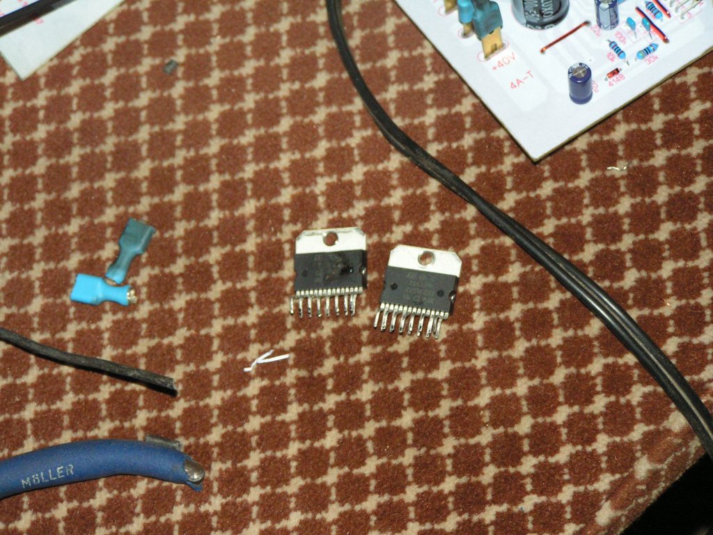 Nálam is megtörtént ! És nem a kapkodás volt a hiba hane4m olyan szarvashibát követtem el ,hogy a táppanelen ellenkezőleg tüntettem fel a polaritást ,persze a végfoknyákon meg helyesen . Az egyik ic -ből "kirobbant" egy darab. Ahogy a képeken is látszik.