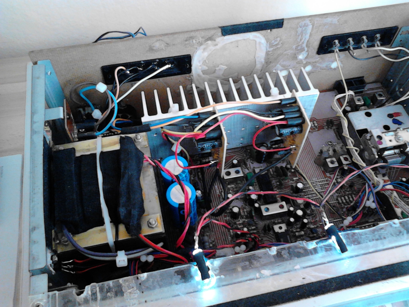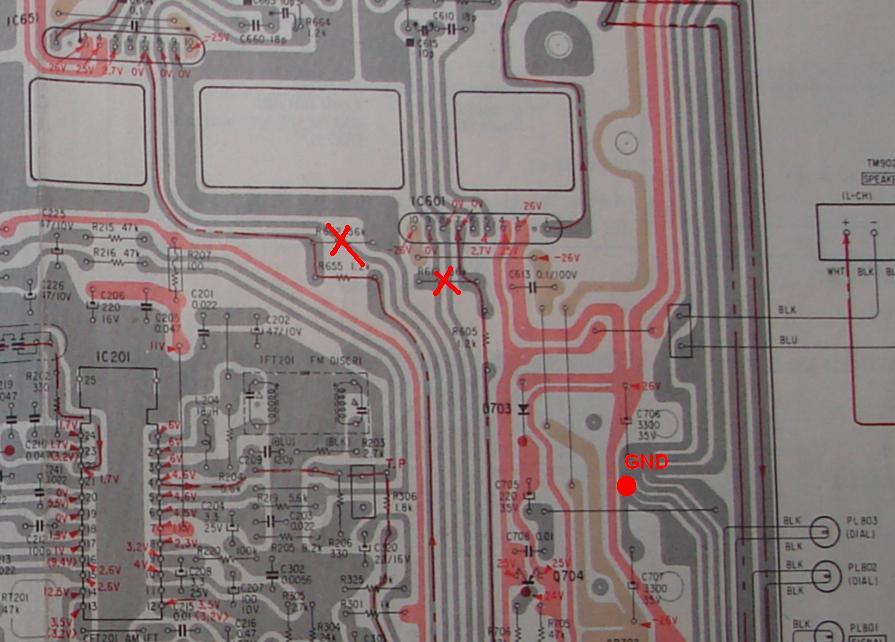 A rádiós-erősítő 3300µF kondenzátorai (C706, C707) elég "soványak", és ha öreg a készülék, akkor a kiszáradás miatt a névleges értékükből még veszíthettek is. Cseréld őket 10000µF-osra! Válassz olyan kondenzátor kivitelt melynek átférője befér a régiek helyére.
