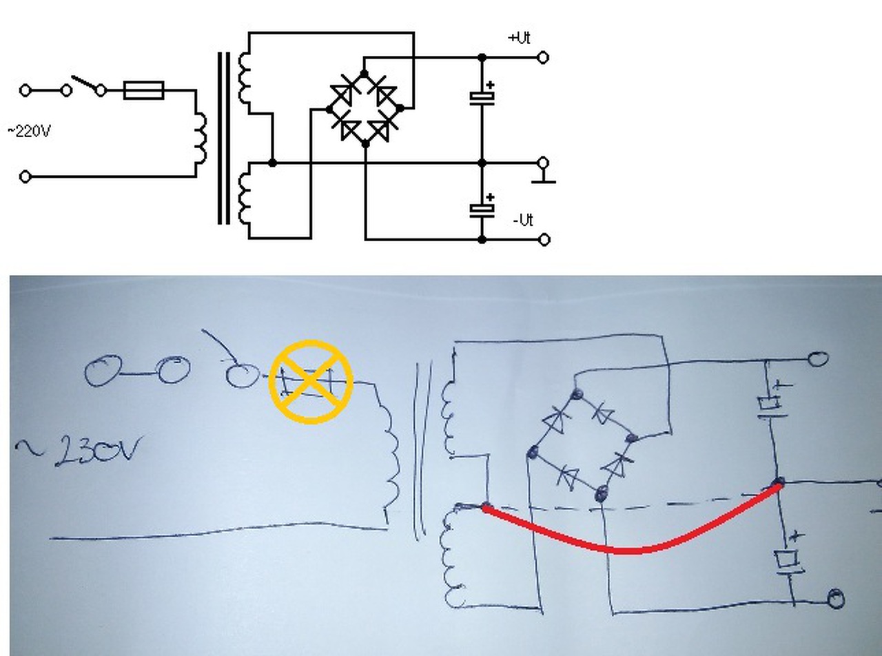 A biztosíték helyére jelöltem egy izzót (230V, 60W), élesztésnél érdemes használnod - mint áramkorlátozót.
