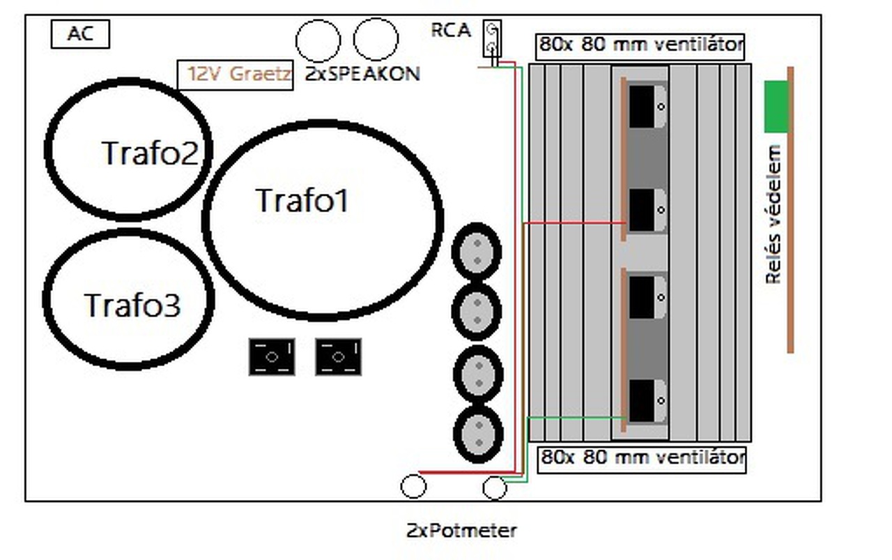 Volt egy képem, de nem találom esetleg holnap küldök. Rajzoltam egy rajzot, ilyen az elrendezés, minden PCB függőlegesen áll. 1-1 Híd panel alatt hűtőtönk van. A végerősítő panelei gyáriak, a relés védelemhez én terveztem a panelt. A jelkábeleket ábrázoltam zöld és piros szinnel, velük bilincselve futnak az egyenáramú kábelek. A jelkábeleknek jól árnyékolt mikrofon kábel van rakva.