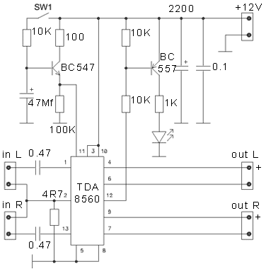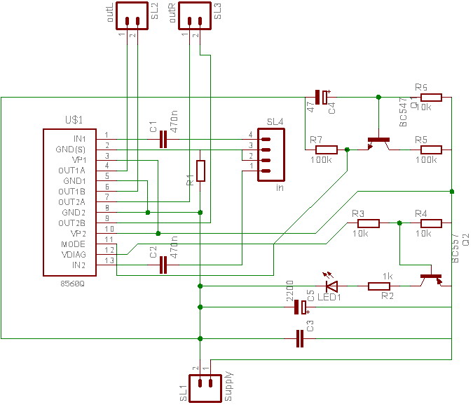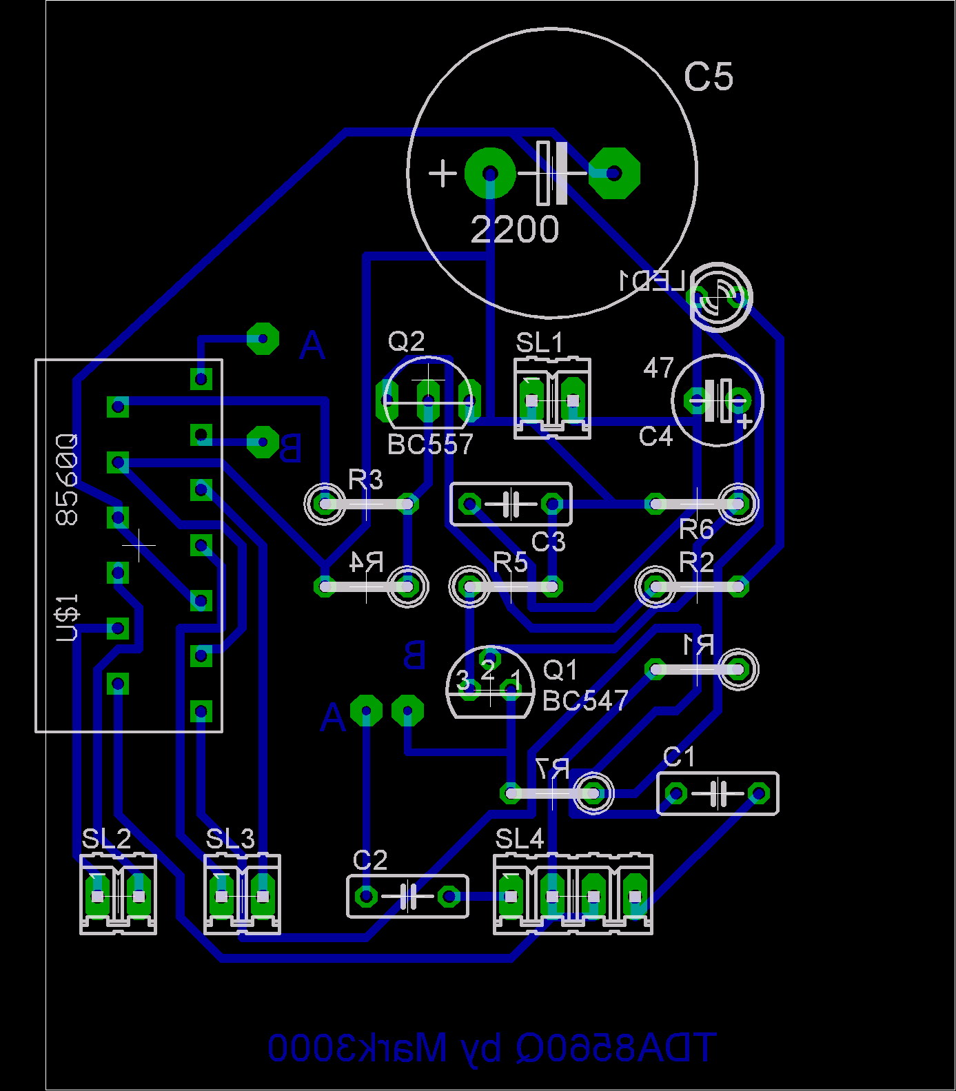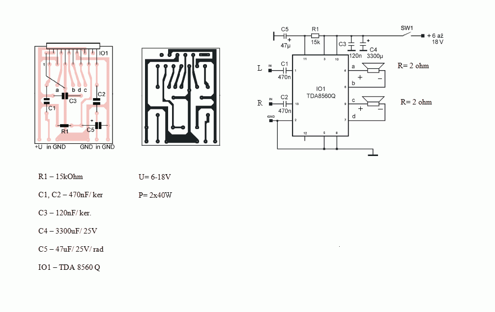 Már építettem egy TDA8560Q-s erőlködőt, de elég gagyi a nyákom hozzá, ez viszont tetszik(amit itt találtam). Ebben benne van a koppanásgátló kör a 11-es lábhoz? Én megépítettem hozzá az adatlap alapján, de nem kapcsol be. Lehet rosz tanyót tettem be. Kell ott vmi értéket, típust nézni? Azt mondák nekem , hogy "Gyakorlatilag bármilyen NPN tranyó jó oda."