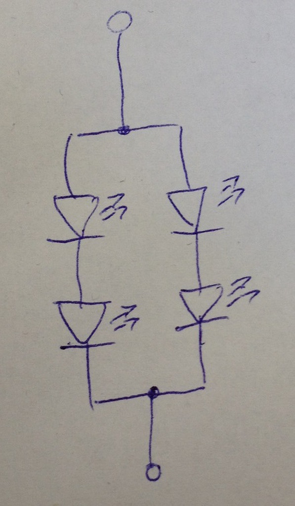 Nem melegszik a PT4115, ilyet nem is írtam, kézzel megfogva (kisujjam vége oda ér) nem érzem, hogy meleg lenne. Tartja az áramot is, pontosabban idővel kicsit feljebb kúszik, gondolom ez a LED melegedésével függ össze. Az emelkedés kb. 10mA nagyságrendű. Vannak fogalmi problémáim. Azt természetesen tudom, mi a nyitó feszültség, de azzal nem vagyok tisztában, hogy ez megegyezik-e azzal a feszültséggel, amit a mértem a LED sarkain (ami a sorkapocsba van direkt kötve, ezért írtam sorkapcsot) Ha megegyezik, akkor leírtam, minden esetre eléggé közelít a mért érték hozzá. Igaz, külön nem emeltem ki hogy 1W LEDek vannak beépítve, csak azt írtam, hogy 4db és 4W a spot. Leskicceltem a LEDek bekötését (4db 1W LED, 2-2 sorosan, majd ezek párhuzamosan) Ilyen gyárilag a nyák. Ezen a kapcsoláson elvileg 700mA áramot keresztül kellene hajtania a PT4115-nek. Mikor 1db volt a PT4115 modul kimenetére kötve, akkor is 24V volt a táp, ergo az nem fogyhatott el. A LED kapcsain mint írtam, ~7,4V-ot mértem, és ~510mA áramot. Nekem ez a furcsa, én azt gondoltam, hogy a PT4115 annyi áramot próbál meg áthajtani, amennyire be van állítva, és ebben a kapcsolásban erre (elvileg) minden lehetősége meg volt. A PT4115 modulok DIM lába fixen 10k-val GND-re van kötve, ez azért van, hogy alapvetően tiltsa a működést. Az AVR szabályozza PWM kimeneten, ami működik is. A mért értékeket kikapcsolt PWM mellett, fix. H szinttel mértem, az AVR tápja 3,3V. Mivel a PT4115 a DIM lábán 2,5V feletti értéket H szintnek tekinti, így a beállított áramot kellene (elvileg) prezentálnia. Ergo én azt gondolom, ez így jó, de a mérések szerint mégsem... Leginkább az furcsa, hogy ~510mA folyik át, ami a kapcsolás szerint LEDenként alig több, mint 250mA és nem kicsit melegszik. Próbáltam részletesen leírni a helyzetet, lehet, le is írtam a probléma okát, csak nem tudom mi az. Lehet nem is probléma, csak nekem tűnik annak.