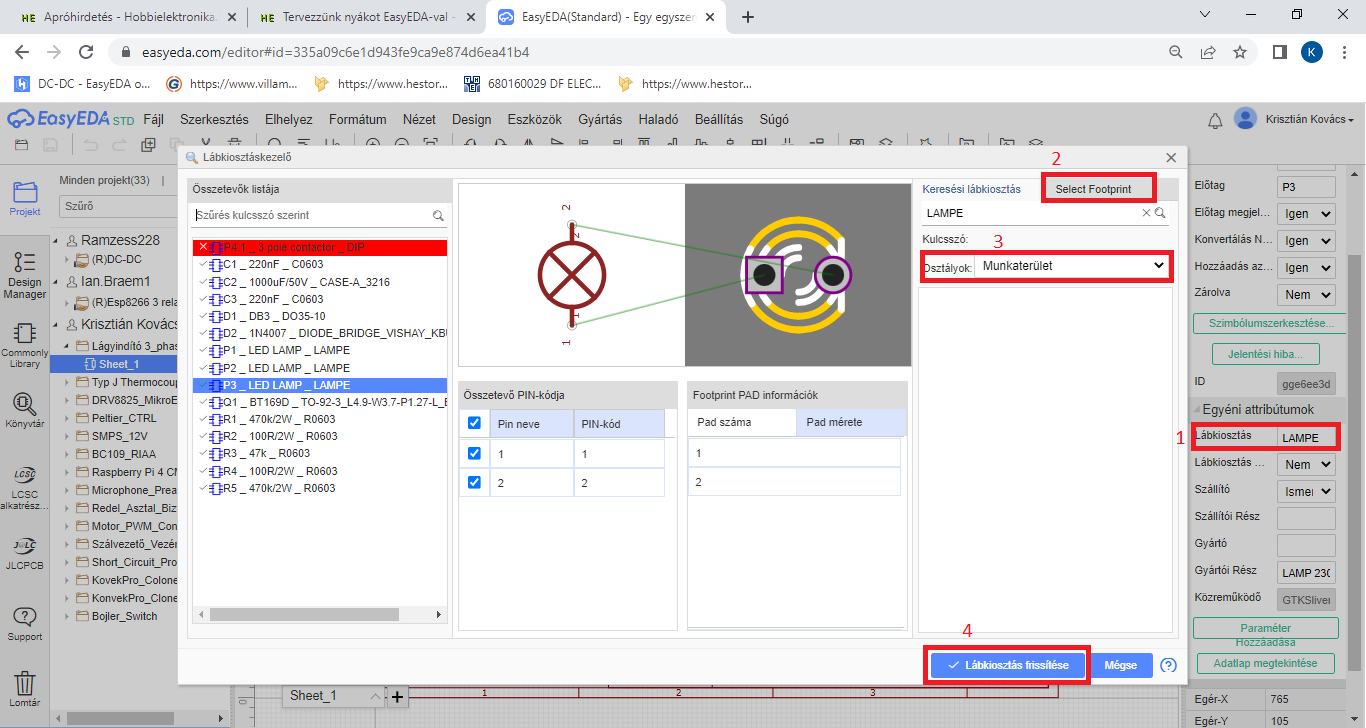 Terveztem symbolt, terveztem footprintet, de nem látom hol rendelem össze alkatrésznek.