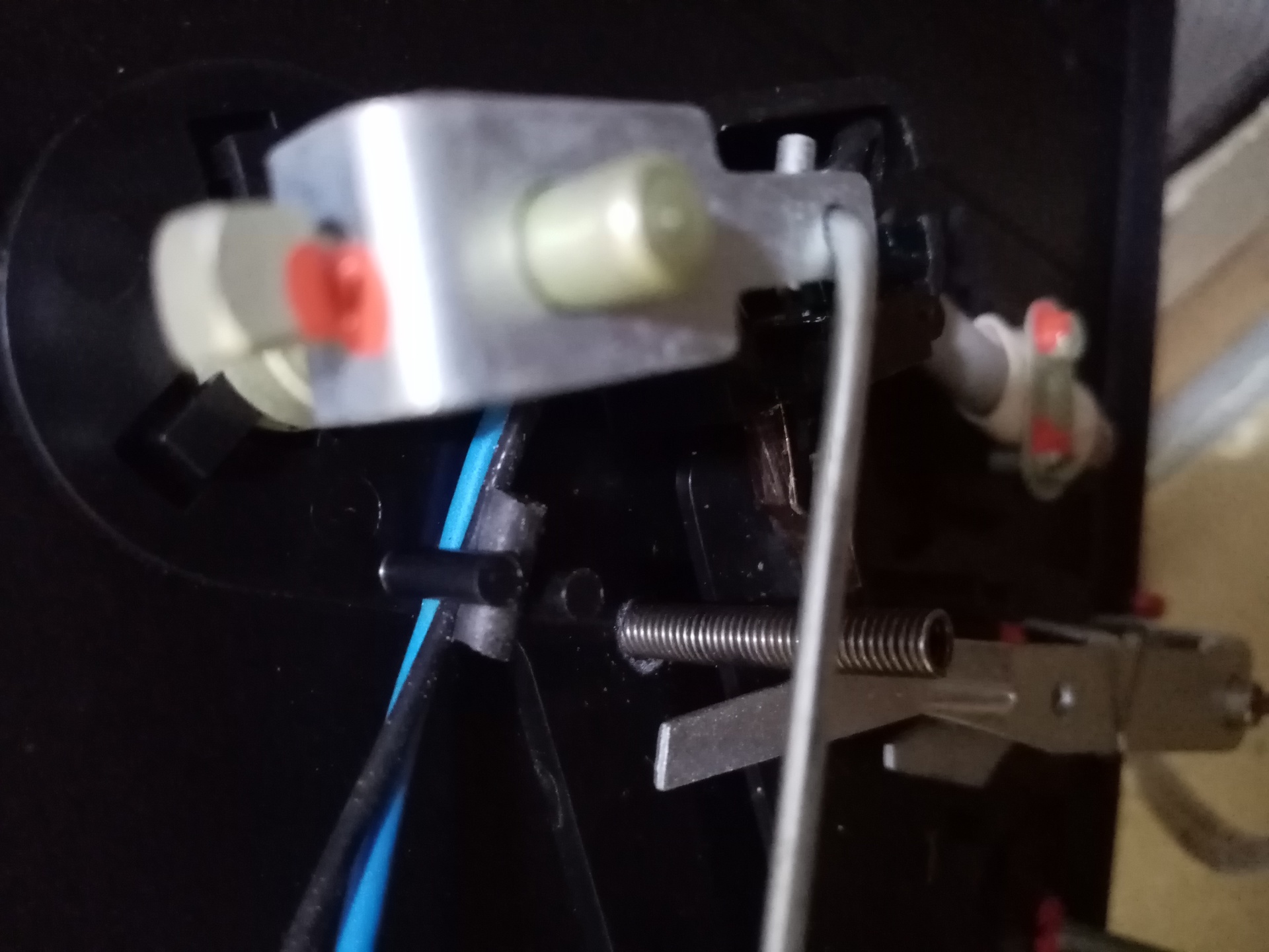 Honnan van leszakadva a hangszedő vezetéke? Alapesetben a karból a mechanika aljába halad a vékony vezeték, ott egy rövidre záró kapcsolóra érkezik, ami a motort ki-be kapcsolóval együtt mozog. Majd innen már vastagabb vezeték megy tovább a készülék hátlapjára szerelt öt pólusú tuchel aljatra, majd innen egy másik vezeték megy az erősítő bemenetére. Ebbe az aljzatba gyárilag egy spec. átkötő dugó van beledugva, ami ha be van dugva akkor a készülék saját erősítére érkezik a jel a hangszedőről, vagy pedig a dugót innen kihúzva lehetőség van másik erősítőre vagy magnóra átvinni a jelet. Az a rúgó, pedig a mechanika aljában valamire csak rá van húzva, pontosan nem emlékszem, hogy hová, de csak ütköző szerepe van.