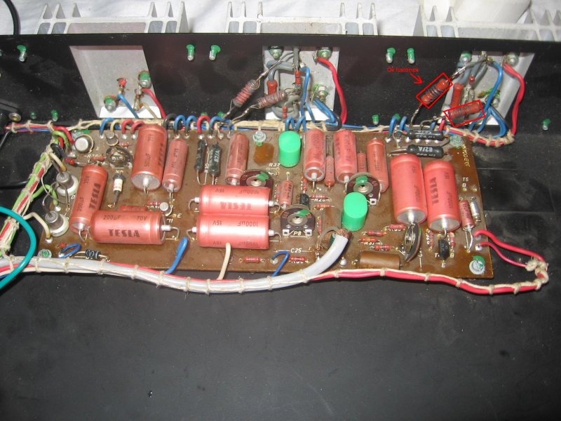 van egy tesla nzc144 típusú lemezlejátszóm, ámde a mechanikája ki lett szerelve belőle. Ráraktam egy jack dugót a tű helyére és csak búgott a hangszóró, majd mikor nézem hogy mi van akkor egyszer csak elkezdett füstölni egyszerre 2 db ellenállás (képen bekarikázva) és elkezdett mégjobban búgni... nem tudom hogy mi van vele szal segítség kéne hogy mit csináljak hogy még működjön? légyszives segítsetek nekem előre is köszönöm