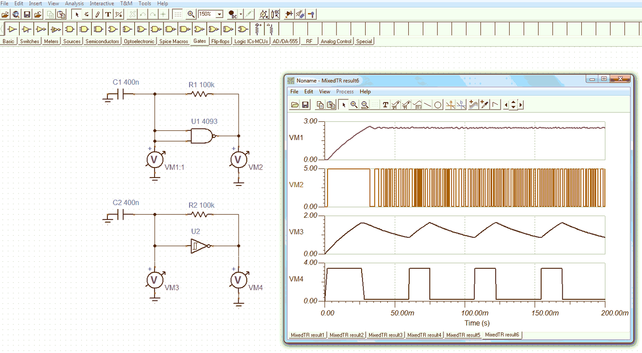 Csinál valamit az áramkör, de meg sem közelíti a valóságot (kb. a táp 1/3 és 2/3 részénél kellene billennie). Úgy tűnik akkor ez egy bug a TINA-ban, amit majd valamelyik verzióban egyszer talán javítanak...