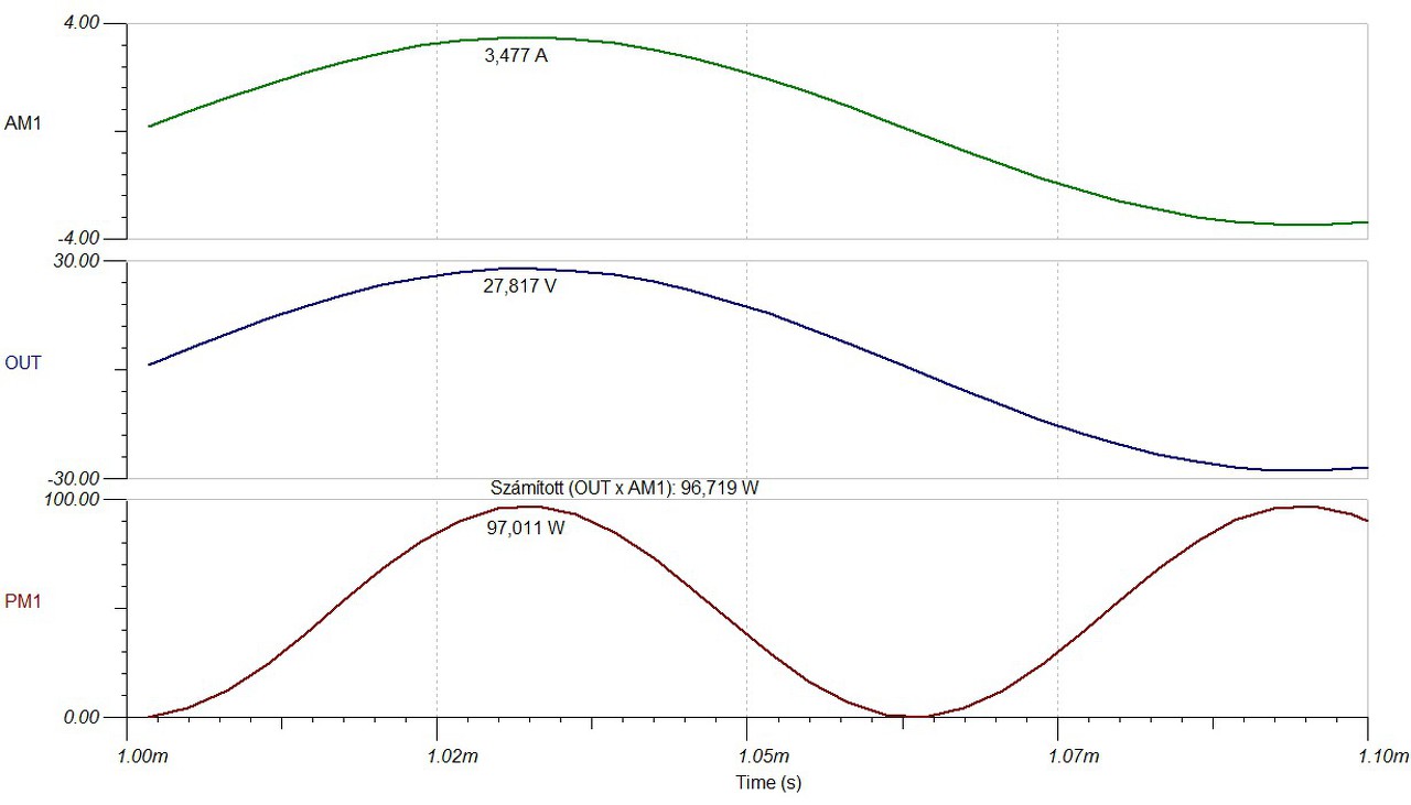 Szia! Elég nyűgösen számítja a teljesítményt. Rátettem szemléltetésként a wattmérő mellé az áramot és a feszültséget is. Ennél az amplitúdónál nagyjából nullát hoz ki, alatta pozitív, felette negatív a számított teljesítmény, értéke pedig messze-messze a valóságtól.
