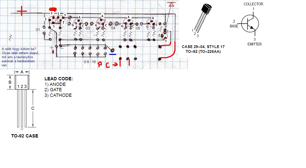 Nézd meg a szóban fogró alkatrészek (tranzisztor és tirisztor) adatlapját! Azon láthatod a lábkiosztásukat.
