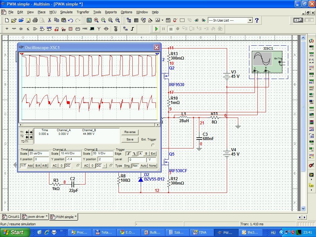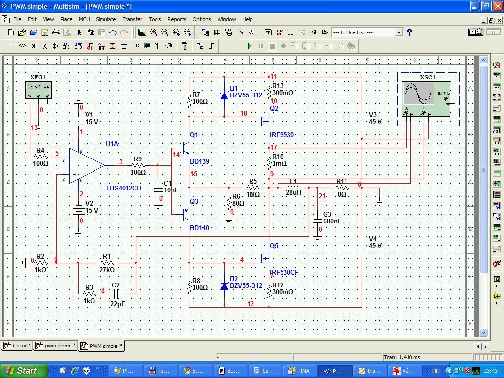 Ám mi történik, ha egy kis fázistolással csatoljuk vissza? D osztály lesz belőle. A faékkel vetekedő bonyolultságú áramkör nem különösebben paraméterekre hegyezett. Viszont a szokottnál 5x kisebb hűtőbordával is elműködik, beállítást nem igényel, szubbasszus erősítőnek tökéletes. A BD tranzisztorokat is hűtőbordára kell tenni. Kaptunk tehát egy B osztályból "begerjesztett" PWM erősítőt különösebb hókuszpókusz, akadémiai szintű műszerezettség, SMD szerelés, stb nélkül. A kapcsolás kb 90W-ig terhelhető 8 ohm-s hangszóróval és 140W-ig 4 ohm-os hangszóróval. A szimuláció Multisim-ben készült, azok kedvéért, akik csak ennek a szimulátornak hisznek.