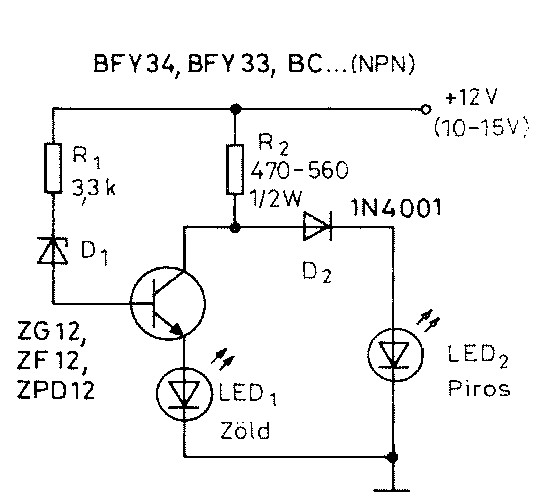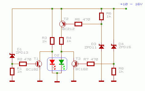 Egy kétszinű leddel dolgozik, 11,5 volt-ig piros, 11,5V-13,5V között narancs, 13,5V-15V zölden világit. 15 Volt felett sötétt marad,vagyis nemvilágit-túltöltés,vagy egyébb hiba. Én megépitettem és tökéletesen dolgozik. A kapcsolást egy másik elektronikai portálon találtam,ha érdekel valakit,akkor késöbb be linkelem.