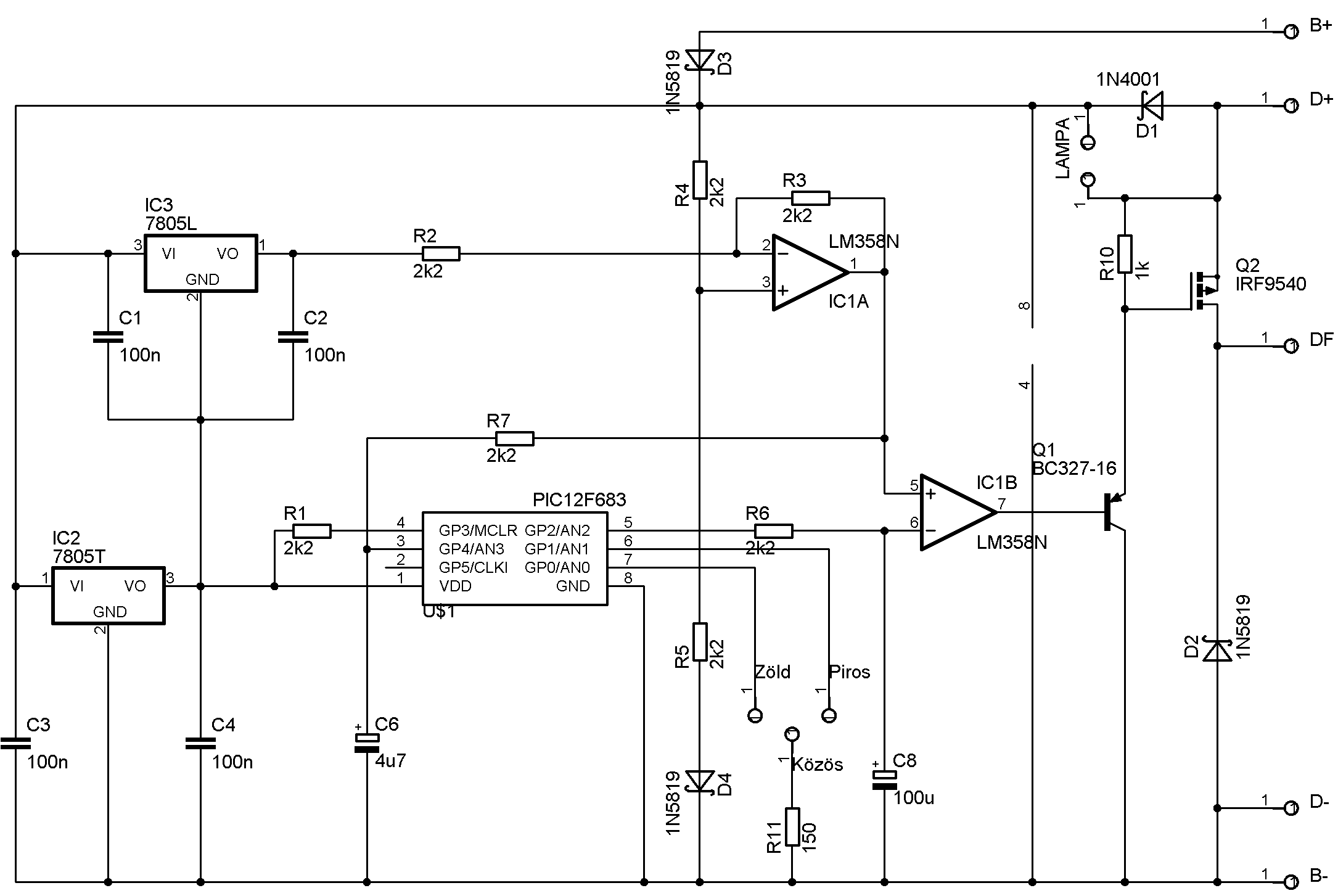 Ezzel az a baj, hogy azt jelzi, hogy menet közben megy-e a töltés, nem pedig azt, hogy az akksi hogy áll. Illetve a kapcsolásban hiba is van, ugyanis a 14.5V feletti feszültség már túltöltés, ezen feszültség fölé nem szabad menni, valamint nem 11V, hanem inkább 11.75V alatt a piros lednek kellene világítania. Ha jár a motor, akkor 14V-nak kell lennie az akksin, a gyári szabályzó ennyin tartja. De az elv jó.