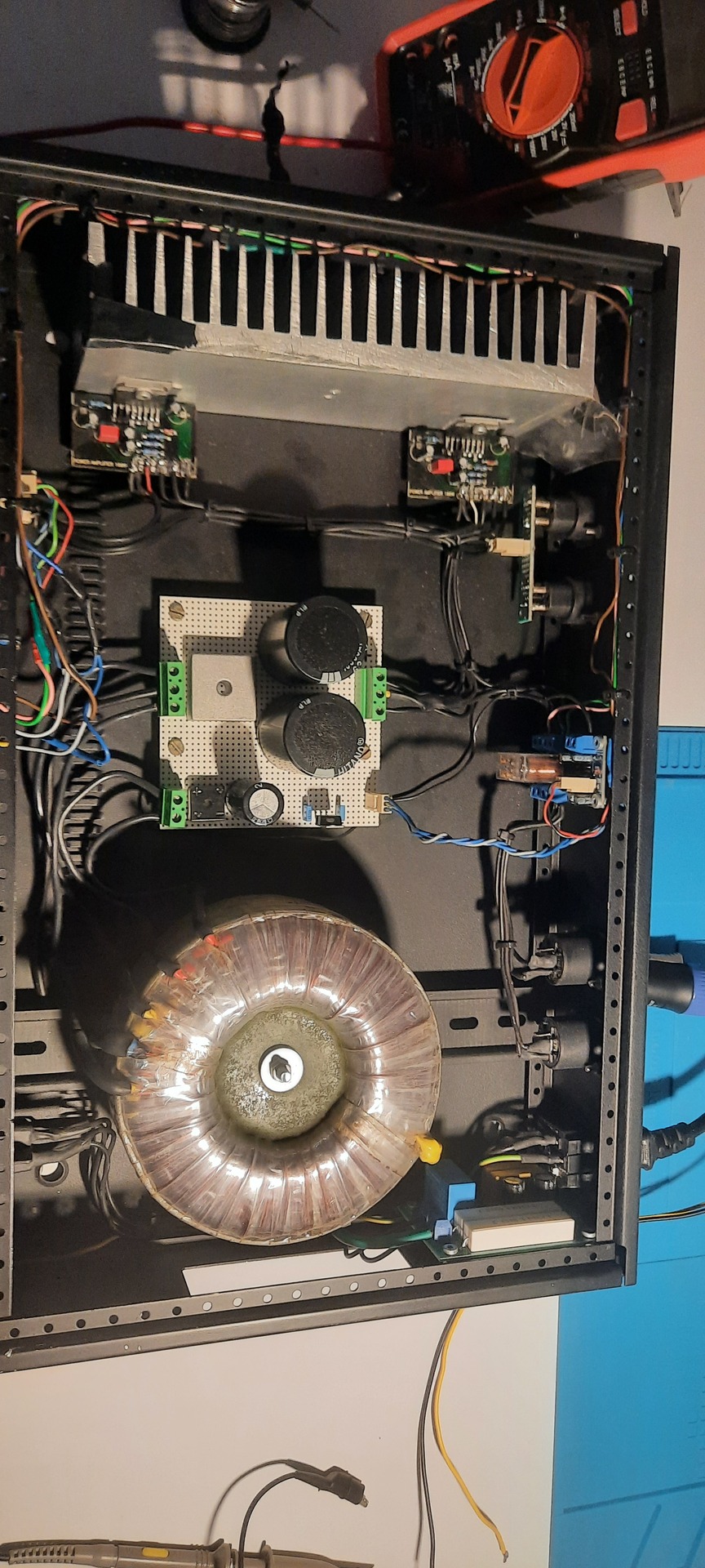 Hangforrást csatlakoztatva a bemenetre és külön - külön meghallgatva a két oldalt, az egyiknek jóval erősebb a brummja. De a másik csati teljesen jó. Rátettem a 2x4700µF plusz szűrést, változást nem tapasztaltam. Összegzésként szerintem a búgósabb csatornát kellene tüzetesebben megvizsgálni, holnapra szétszedem és befotózom nyák és beültetési oldalról is.