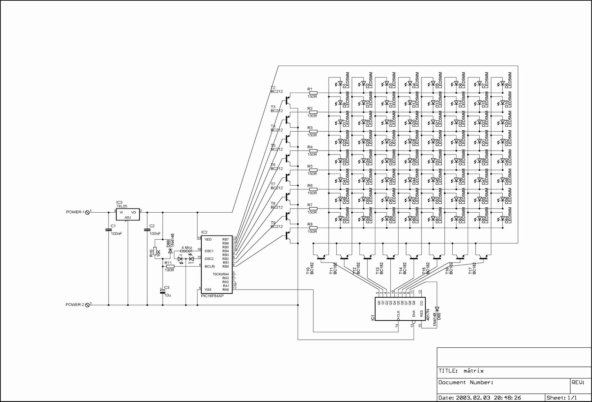 Pár éve a lomexben vettem egy 8x8-as kijelzőt hasonló feledatra. Egy régi Rádió Technika évkönyvben lévő kapcsolás volt az alap. Az abban lévő epromot váltottam ki egy 16F84-el. A program végtelenül egyszerű. Az Eagle-ben nem találtam oszcillátort, ezért egy duo LED-el helyettesítettem .