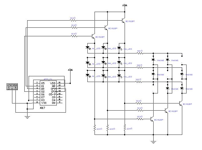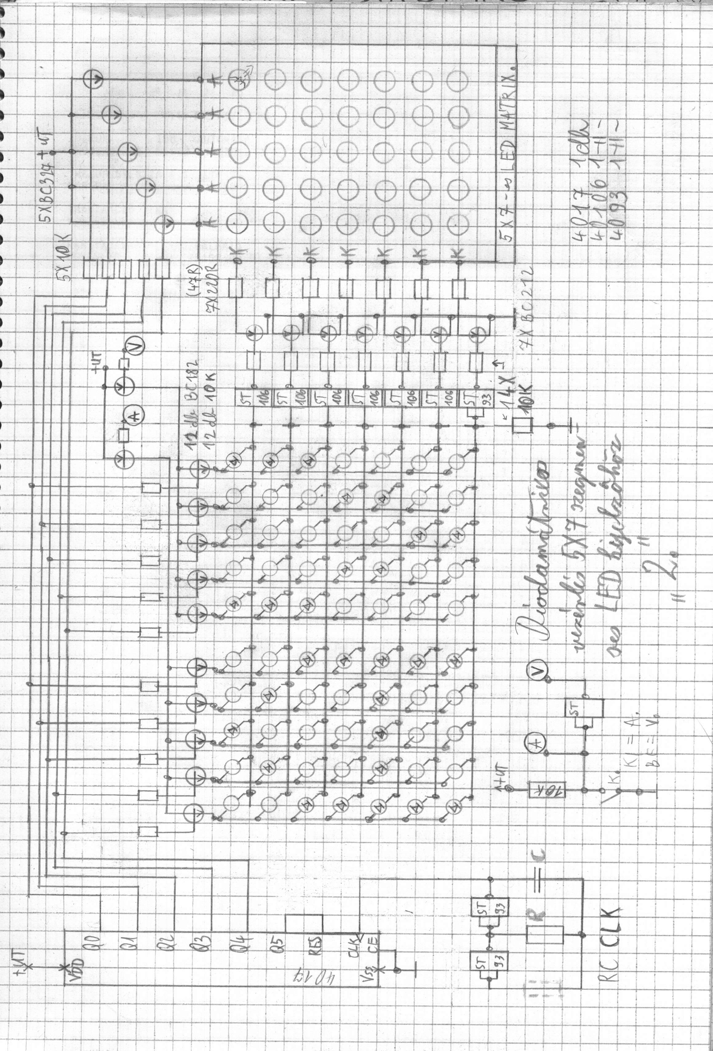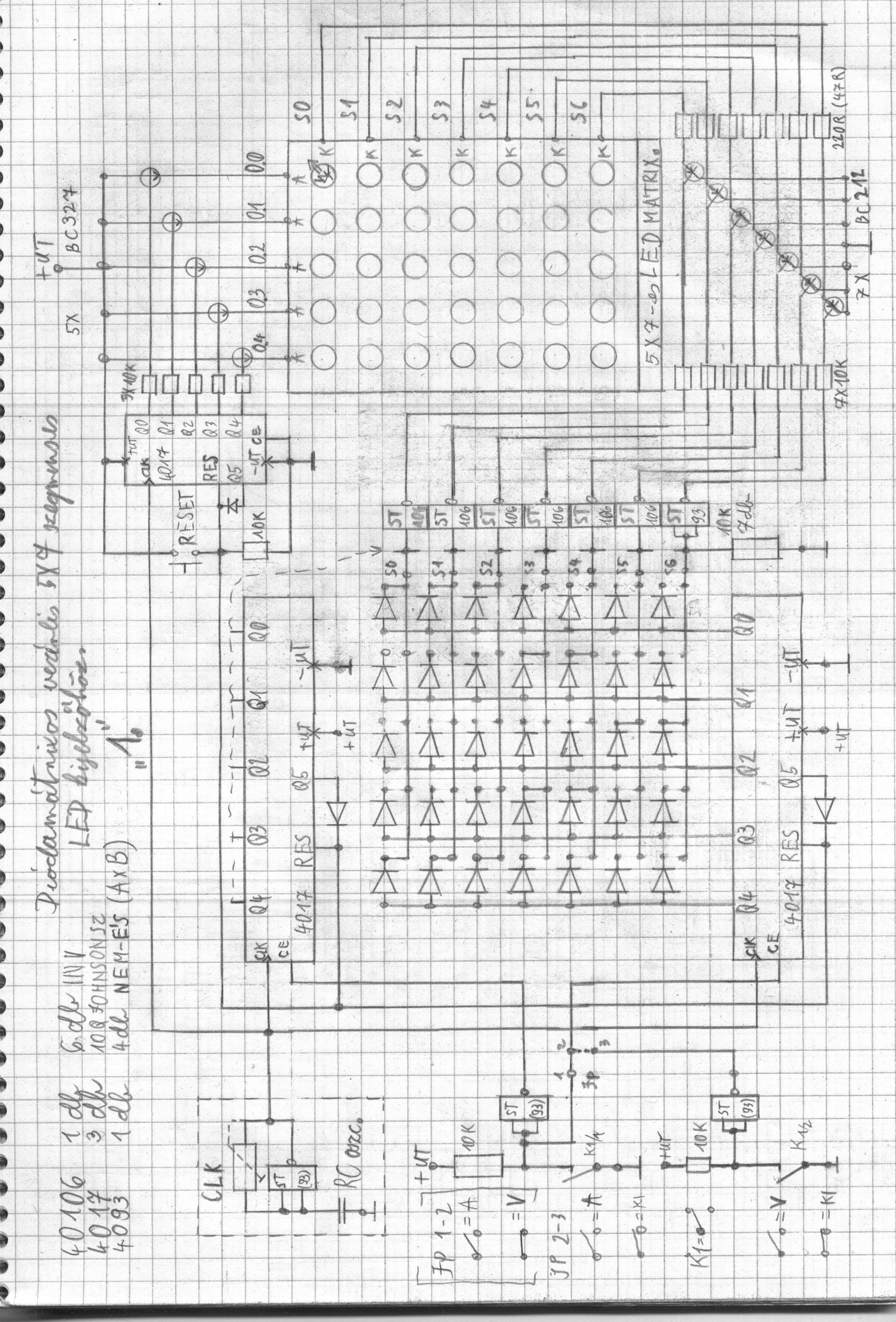 Alapgondolatként arra gondoltam: az oszlopokra rakok meghajtótranzisztorokat, a sorokat a 4017 kimeneteire kötöm. Elindul a számláló -> első sor vezérlése, plussz átkötöm egy diódamátrixxal a megfelelő oszlopokmeghajtó tranzisztoraira is a vezérlést ->számláló tovább lép, következő sor és az abból szükséges oszlopok. Az egyetlen bökkenő a diódák sokasága...