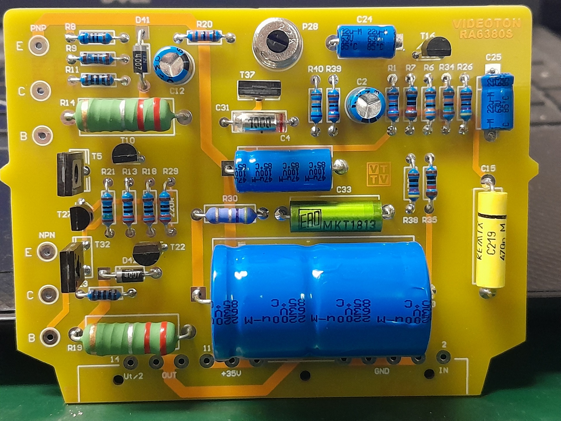 Szombati elfoglaltság. Eddig egy HTA30 dolgozott a vidiben, de kellettek a tranyók belőle. Mióta megvan ez a kis D-osztályú bele akartam applikálni a videotonba, de túl nagy volt a tápfesz. Nézgetve a kapcsolási rajzot, észrevettem, hogy van középen egy megcsapolása a trafónak. A kivezérlésjelzők arról mennek. 29V jön le róla egyenirányítva, pont ideális a D-osztálynak.