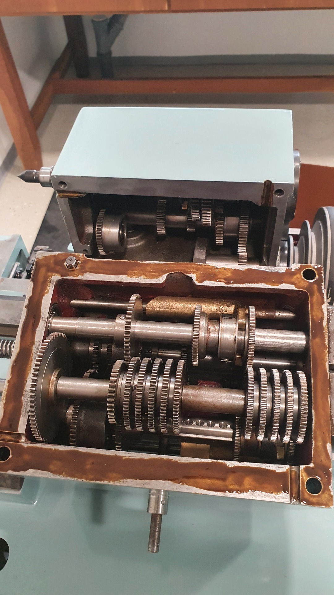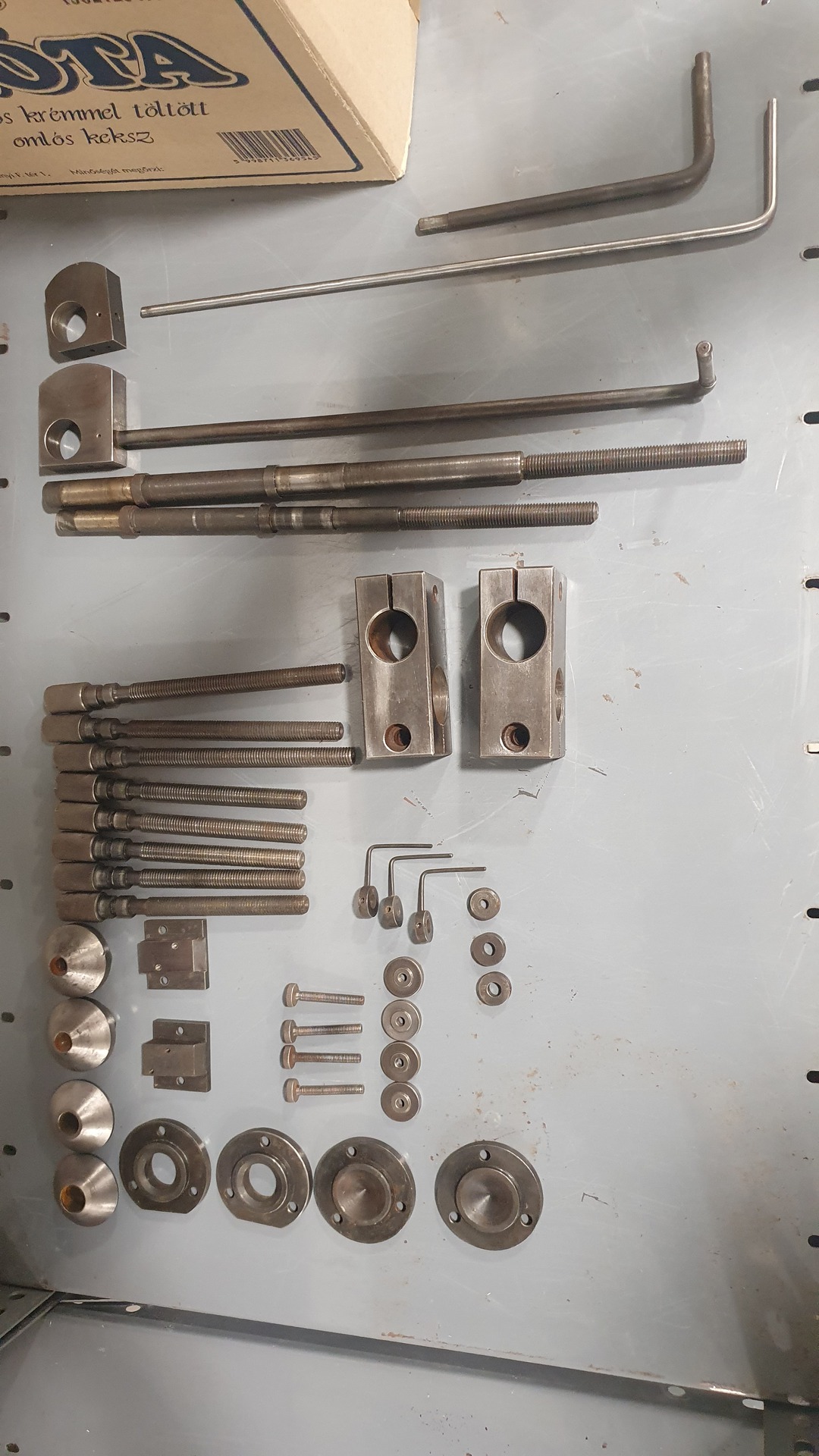 Közben haladtam a szálfeszítőkkel is, új szalagfékeket csináltam, új csapágyakat kaptak, és újra lett barnítva a legtöbb alkatrésze. Sajnos a kisebbik szálfeszítő felső görgője, és a rögzítő gyűrűi hiányoznak. Ha esetleg volna valakinek felesleges, szívesen átvenném. Ha nem lesz, esztergálok másikat.