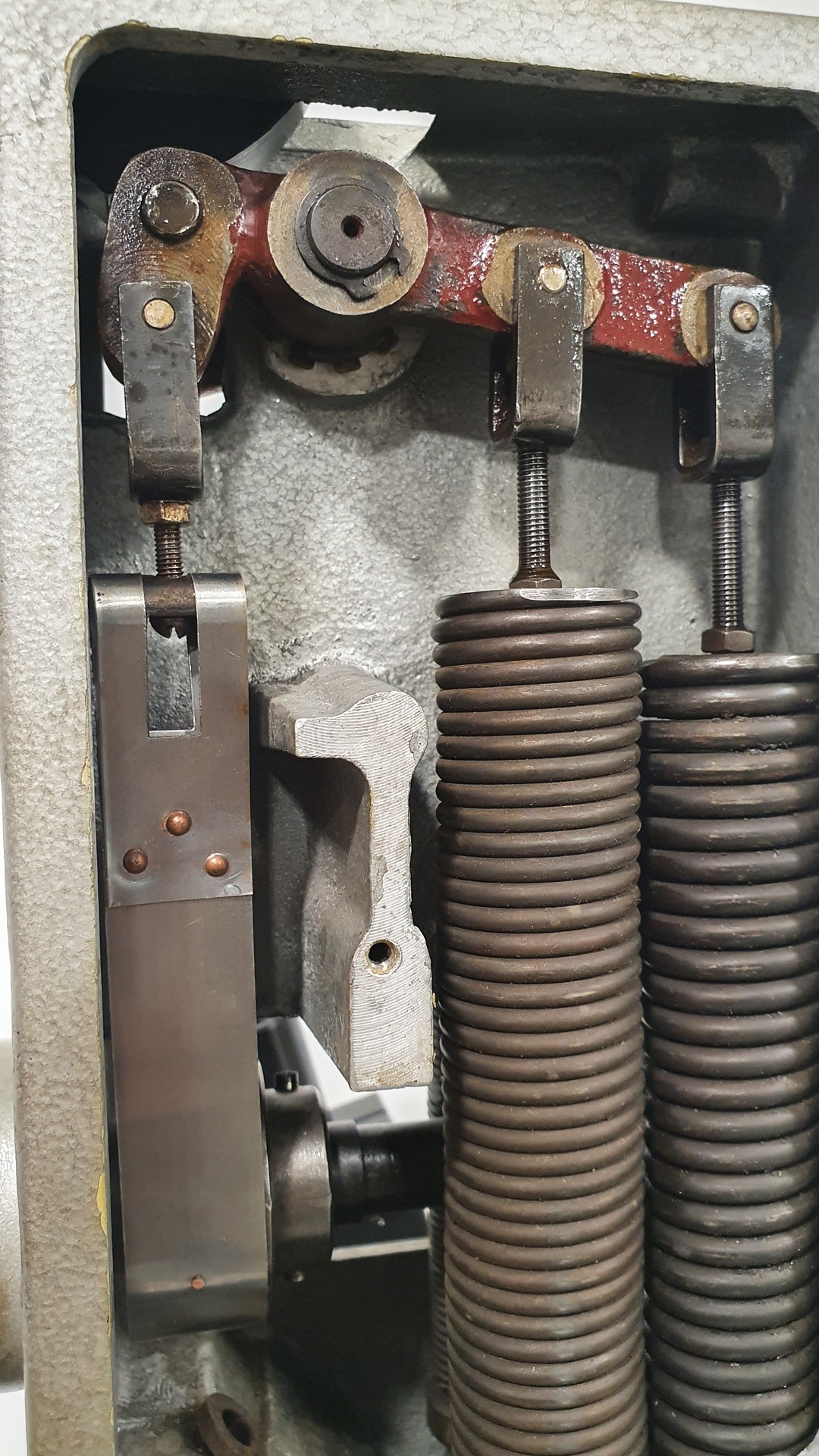 Lassan elkészül a gépem, sokat dolgoztam rajta, sajnos a MÉH telepről került vissza, ahol fejjel lefelé volt sokáig egy konténerben, így a hajtómű házában az olaj helyet cserélt az esővízzel. Majdnem az összes csapágyat ki kellett cserélnem az egész gépben. Újra festettem, mert tenyérnyi darabokban vált le az öntvényvázról gitteléssel együtt a festék. Egy kis szemcseszórás, glettelés, és festés után már egészen elfogadható a kinézete is. Még a szálfeszítők, és a számláló felújítása van hátra, és kész! A modernizálás egy második lépcső lesz, az eredeti állapot megtartásával.