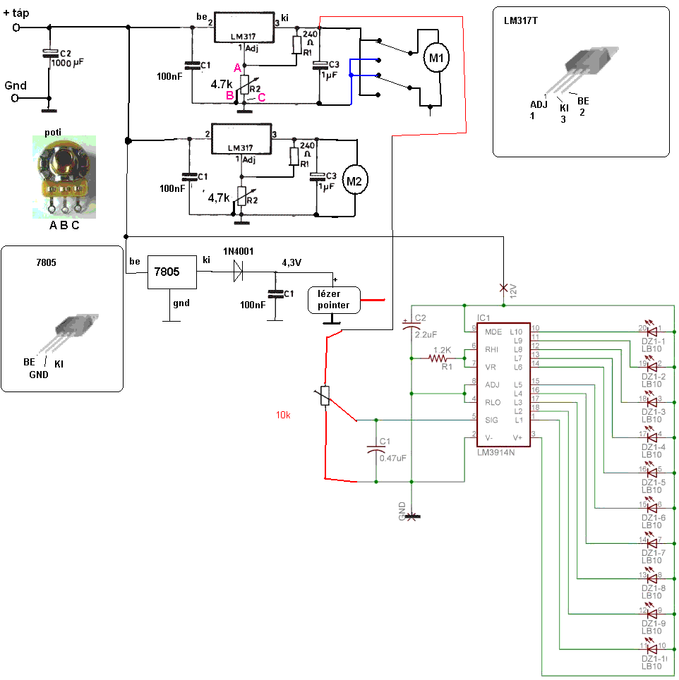 A lézerpointernek tápfeszültséget egy 7805-ös IC, egy 5V-os stabilizátor szolgáltatja, aminek a kimenetével sorba van kötve egy dióda, amin esik kb 0.7V, és így kapsz a kimeneten kb 4,3V-ot ami meg szerintem bőven elég a lézerpointernek. A 7805-ös IC, és az LM317, az maximum 37V-ot visel el, persze hűteni is kell. Az áramkörre minimum 8V-ot kell kapcsolnod. A részletek a rajzon