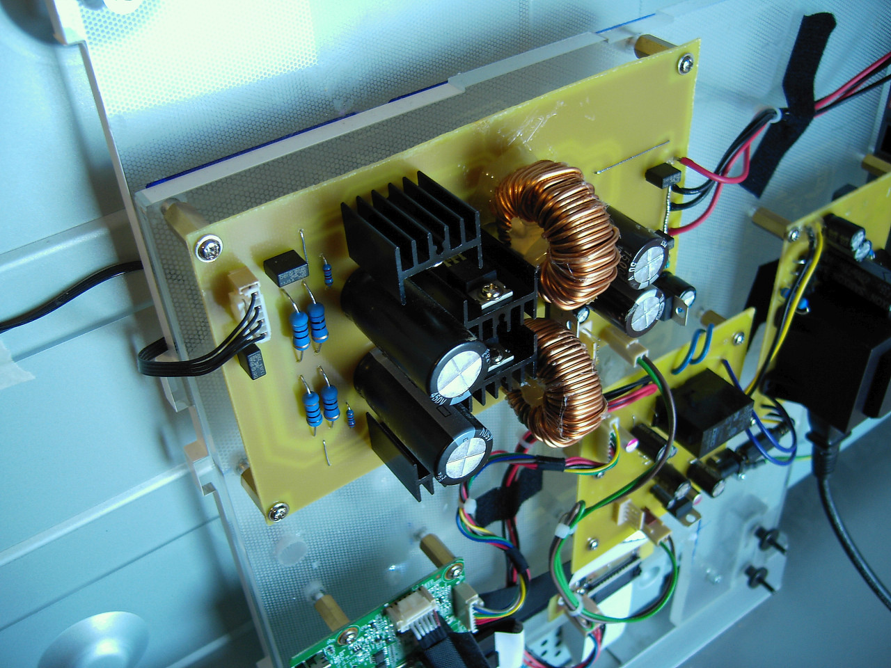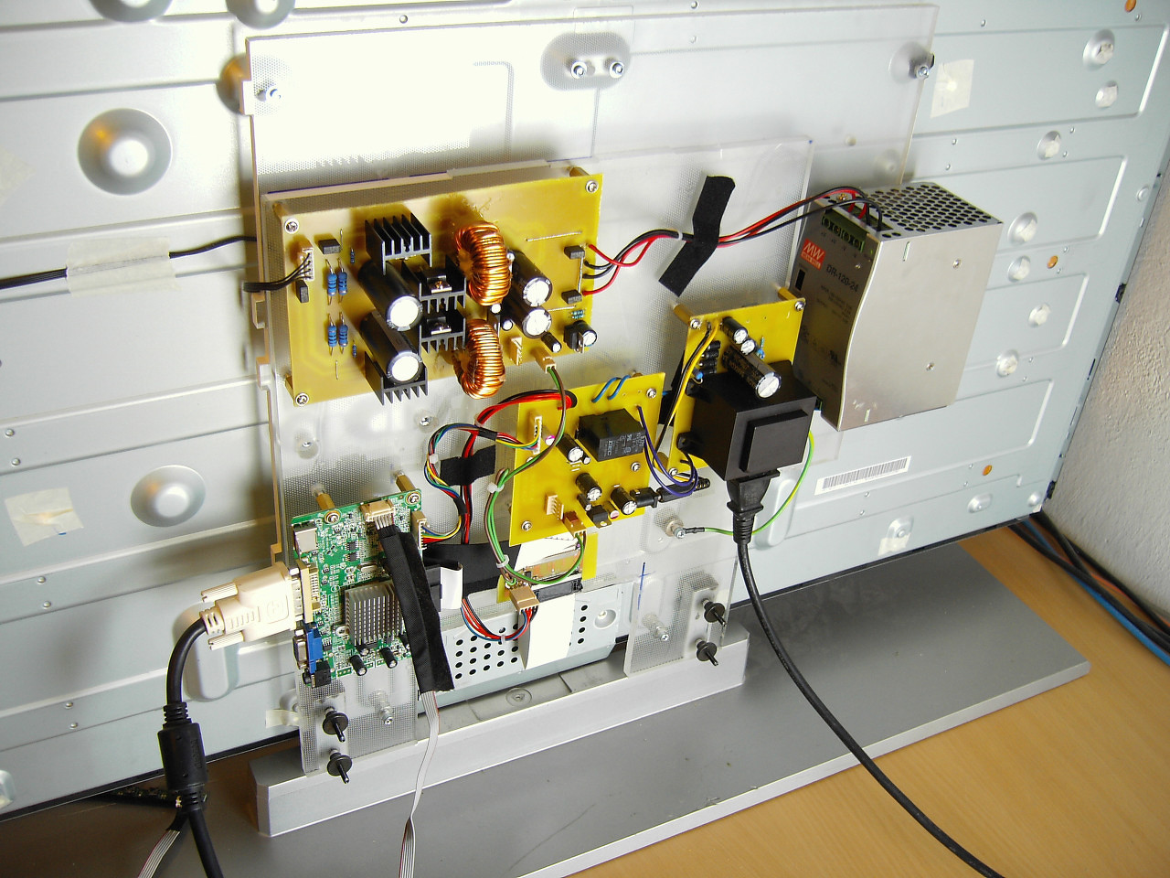 Készült egy szintén 47-es monitor, de ez már ledes. Ezúttal sincs semmi extra, gyári novatek IC-s LG monitor scalerja, és egy 12V táp kapcsolóüzemű DC-DC konverterrel, illetve még egy panel ami ki-be kapcsolásért felel, továbbá a fényerőszabályzásért is, de az ezúttal nincs használva. A ledek 95V 250mA-el mennek, amit MC34063-al megoldott step-up konverter álít elő 27V-ból áramgenerátor módban, továbbá PIC is figyeli az áramot és túláram vagy szakadás esetén leállítja a konvertereket. Egy kis panel konvertálja a monitorokban használatos 30pin LVDS-t 50PIN LVDS-re, illetve a kijelző 12V tápját is ez kapcsolja egy P csaornás fet-el.
