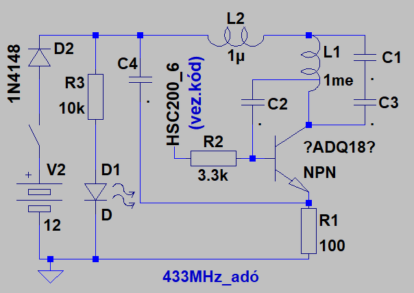 Van néhány kapunyitó távirányítóm, de az egyik megadta magát. A kód az adótranzisztorra megérkezik -hibamentesen, logikai analizátorral ellenőriztem- viszont a 433MHz nem megy ki. Egy RFM83C vevővel tudtam ellenőrizni. Az adó kapcsolási rajza a mellékletben. A tranzisztor diódavizsgálat szerint jó, és szakadást sem tapasztaltam a NYÁK-on. Milyen irányba induljak a hiba felderítésben? Ha tranzisztor csere kell akkor milyet javasoltok? (Ami a rajzon van ( ?ADQ18? ) az a tranzisztoron levő felirat.