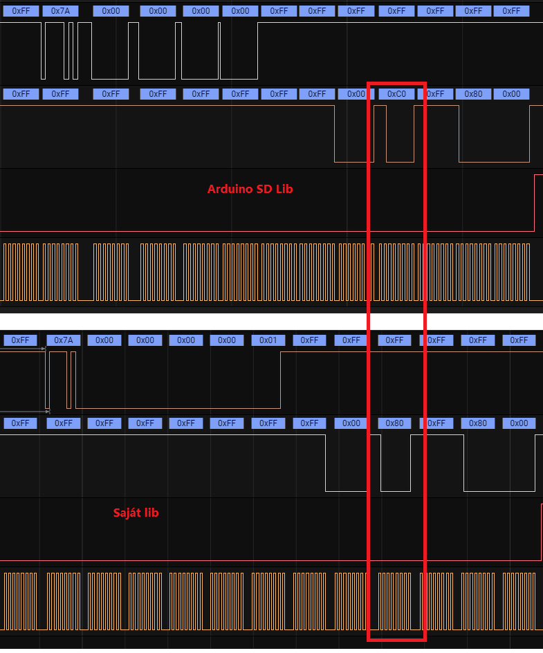 Szia. Kipróbáltam ugyanazt az SD kártyát és slotot arduinoval és a saját kódommal. Mindkét esetben az inicializáls ugyanaz. Egy különbség van a CMD58-ra arduino esetében 0x00C0FF80 val felel én kódom esetében 0x0080FF80-al. 1 bitnyi különbség. Van valami tipped mi lehet az oka?