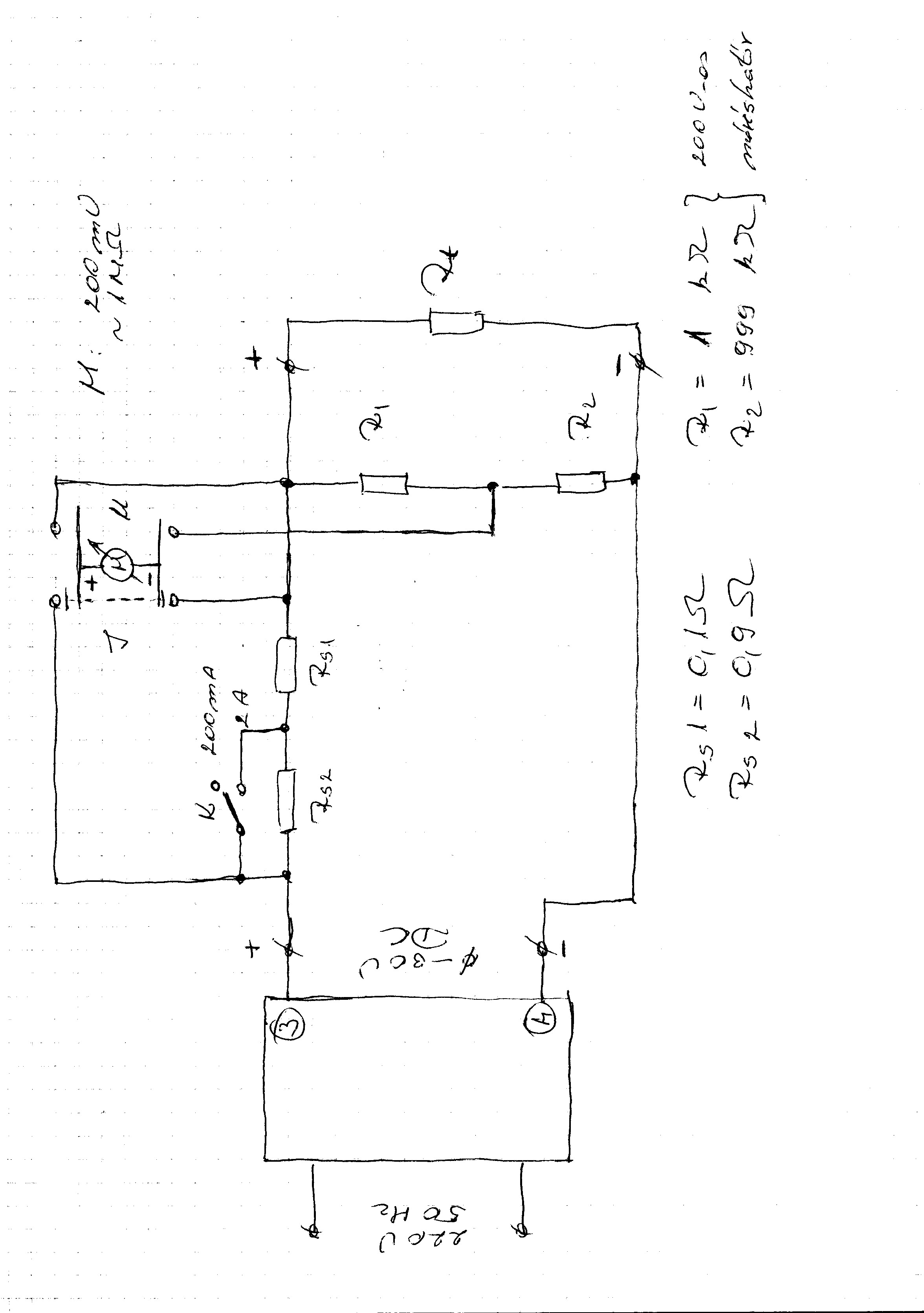 A műszer ugyi 200mV-os (a kijelzés formája: 1999) Tehát a műszer 200, 20, vagy 2V-ra előtétezhető. (Ha más feszt akarsz a 200mV-os végkitéréshez, akkor mindíg át kell számolni. - Ki akarja?) Tehát újra a feszültségosztó: R2 = 1Mohm 2V -> R1 = 101kohm 20V -> R1 = 10,1kohm 200V -> R1 = 1,01kohm (Egyébként 30V-ra az R1 = 6,711kohm.... Bocs.) A sönt jó.