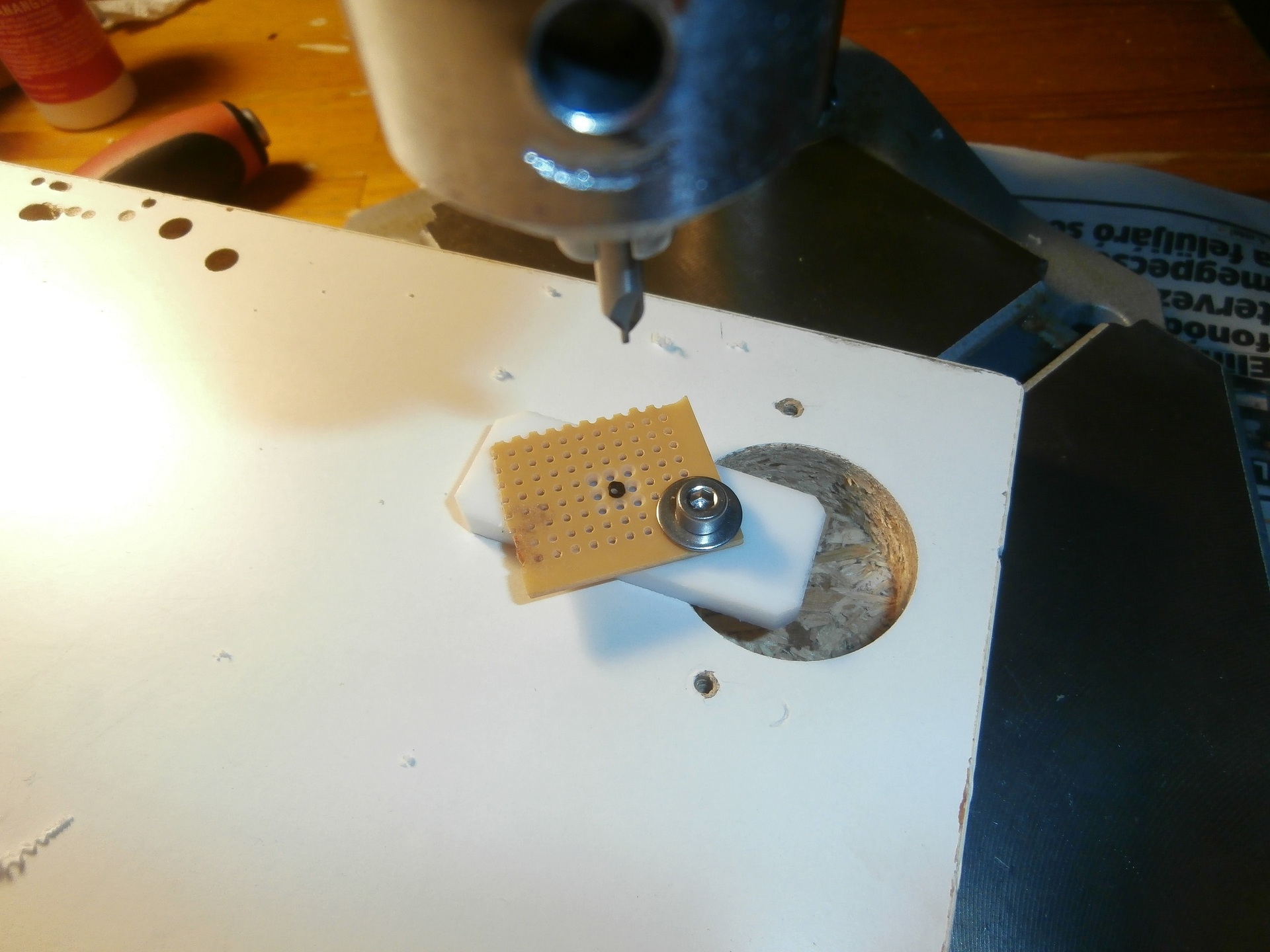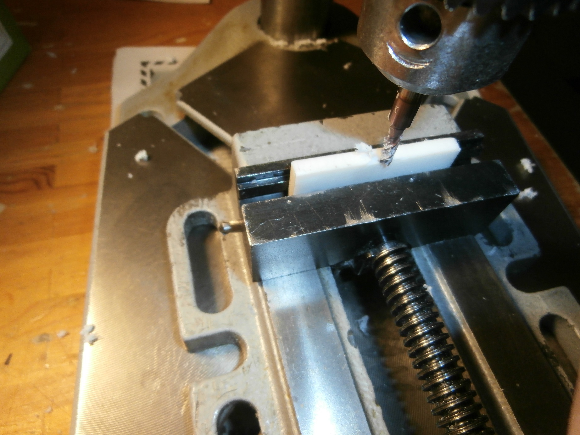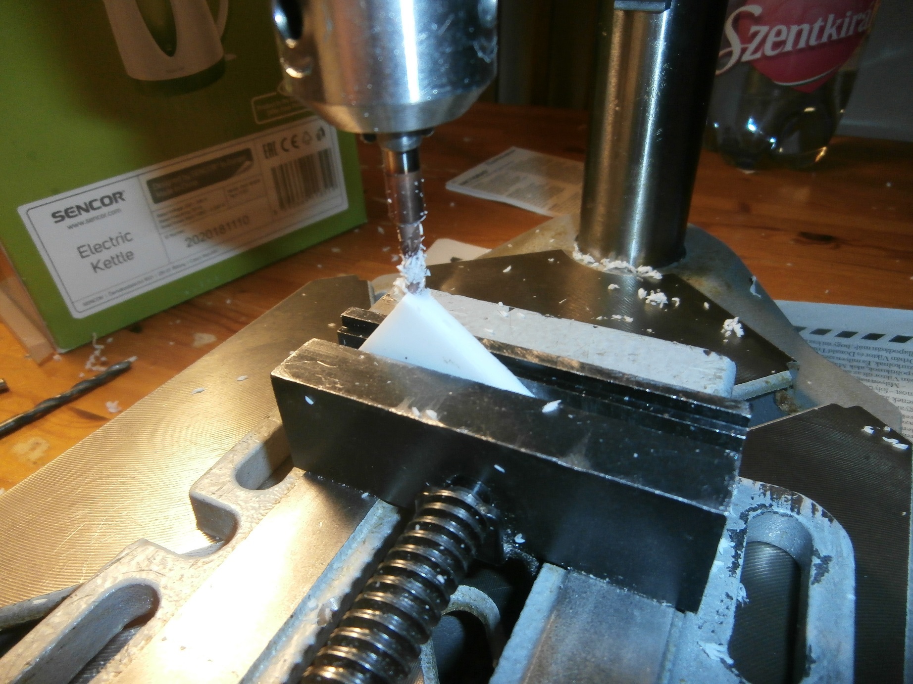 Végül is a szegecsfejes megoldást választottam, hogy érintő forrasztással lehessen a kötéseket abszolválni a négy láb térbeli kilógása miatt. Így távolabbi forrasztás adódik az IC toktól is. Azonban a Kínai állványos fúrógéppel nem lehet csak úgy teflonba derékszögbe 1mm-es furatot fúrni ilyen hosszon. Így muszáj 1mm-es központfúrót venni hozzá a siker reményében, hogy az azzal előfúrt furat megvezesse az 1mm-es fúrót.