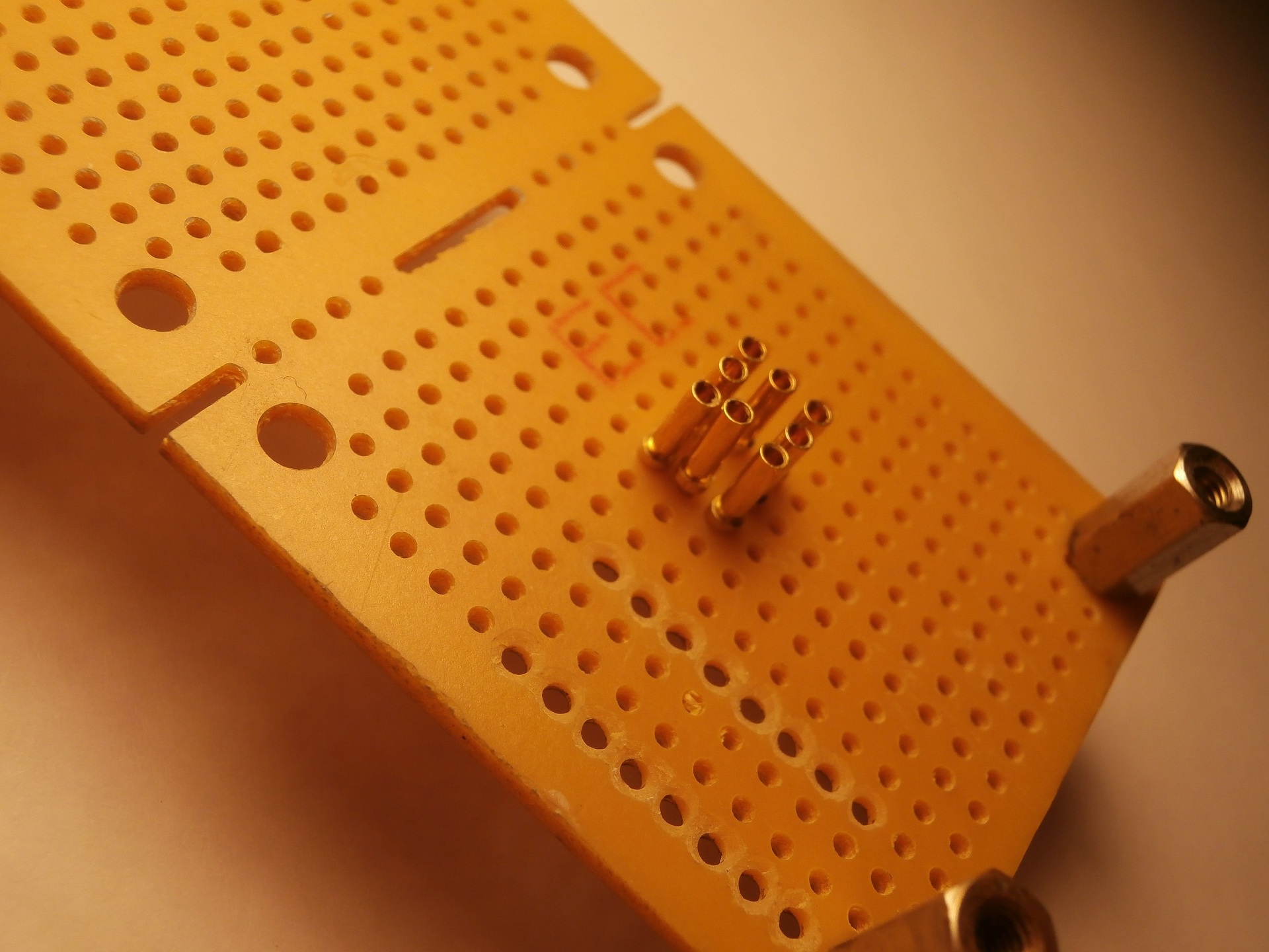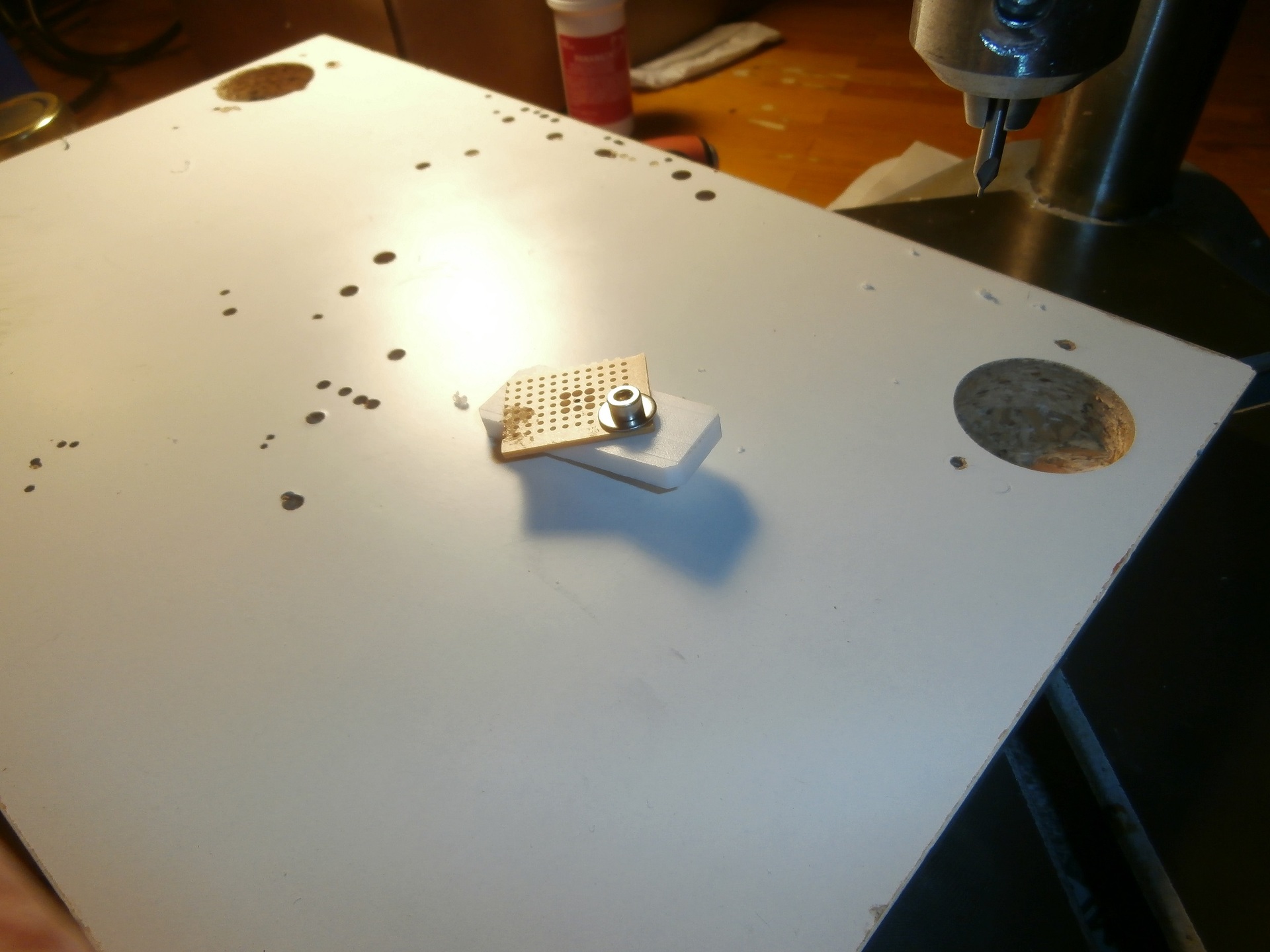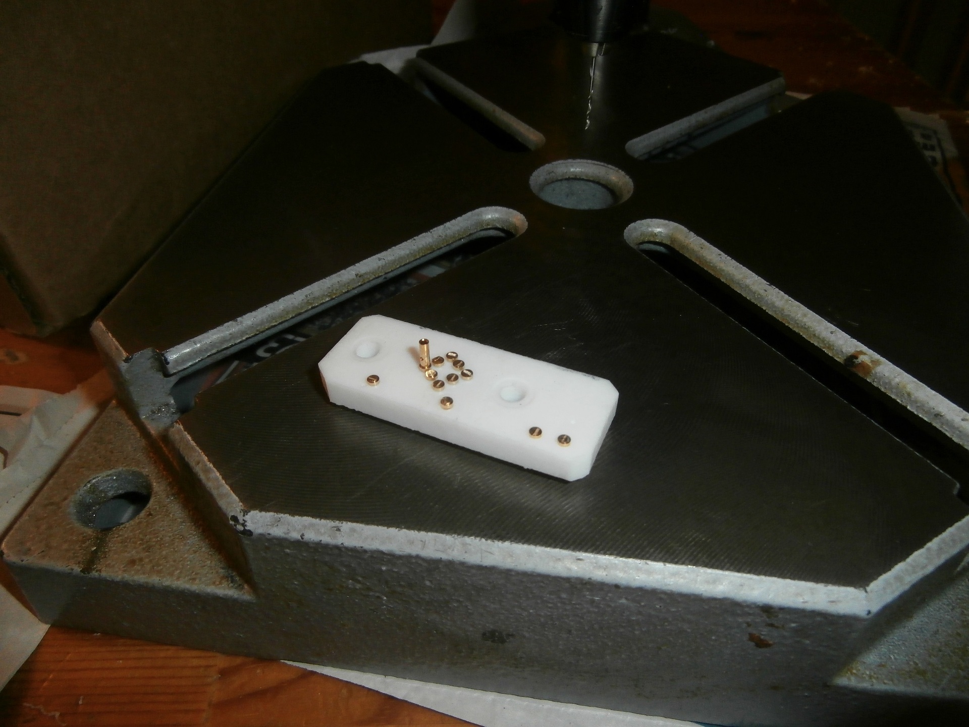 Végül is a szegecsfejes megoldást választottam, hogy érintő forrasztással lehessen a kötéseket abszolválni a négy láb térbeli kilógása miatt. Így távolabbi forrasztás adódik az IC toktól is. Azonban a Kínai állványos fúrógéppel nem lehet csak úgy teflonba derékszögbe 1mm-es furatot fúrni ilyen hosszon. Így muszáj 1mm-es központfúrót venni hozzá a siker reményében, hogy az azzal előfúrt furat megvezesse az 1mm-es fúrót.
