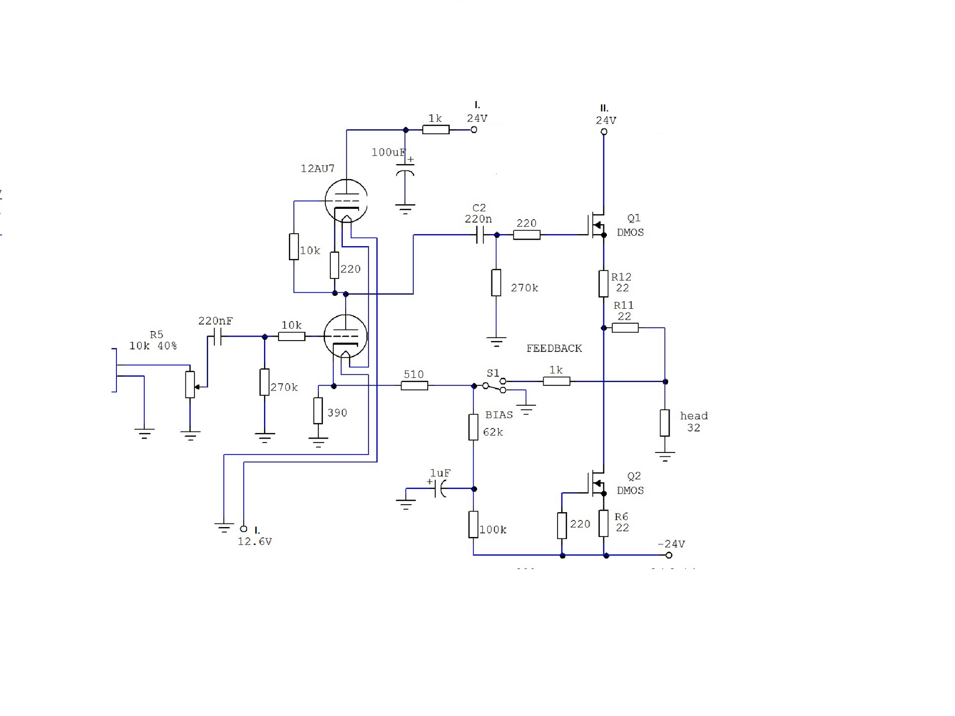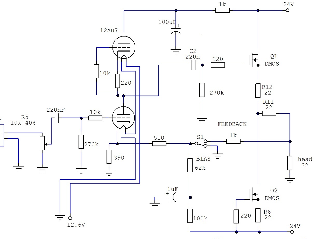 Mivel felmerült a kimenet direkt csatolása, csakis stabil kompenzált önbeálló áramkör jöhet számításba. DMOS kimeneti tranzisztor áramgenerátoraként csakis ugyanolyan DMOS elemet tudok ajánlani, mivel ezek együtt változtatják a paramétereiket, így nem fog elmászni a kimeneti nulla Volt. Az alsó trióda katódkörében történt egy kis változtatás, hogy visszacsatolás igény esetén ne legyen DC a kapcsolón, ne kattanjon. Lehetett volna kondenzátoros leválasztás, de mivel ragaszkodsz a drága kondenzátorokhoz, így inkább ezt a megoldást láttam kedvezőbbnek. A csövek fűtése most nem aktív része a kapcsolásnak, így azt külön kell megoldani.