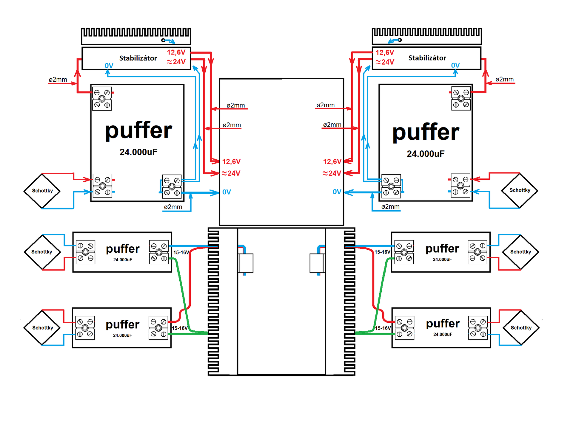 Az előző hibridrajzod szerinti lesz a táp, de ezúttal mivel nem a FET lesz a feszültségosztó, hanem egy hűtött ellenállás a stabba. Lényegében hasonló elv szerint gondoltam, vagyis a poti a stabba a 12.6 voltot állítja be, ezért nem pont 24 volt kerül a csőre.